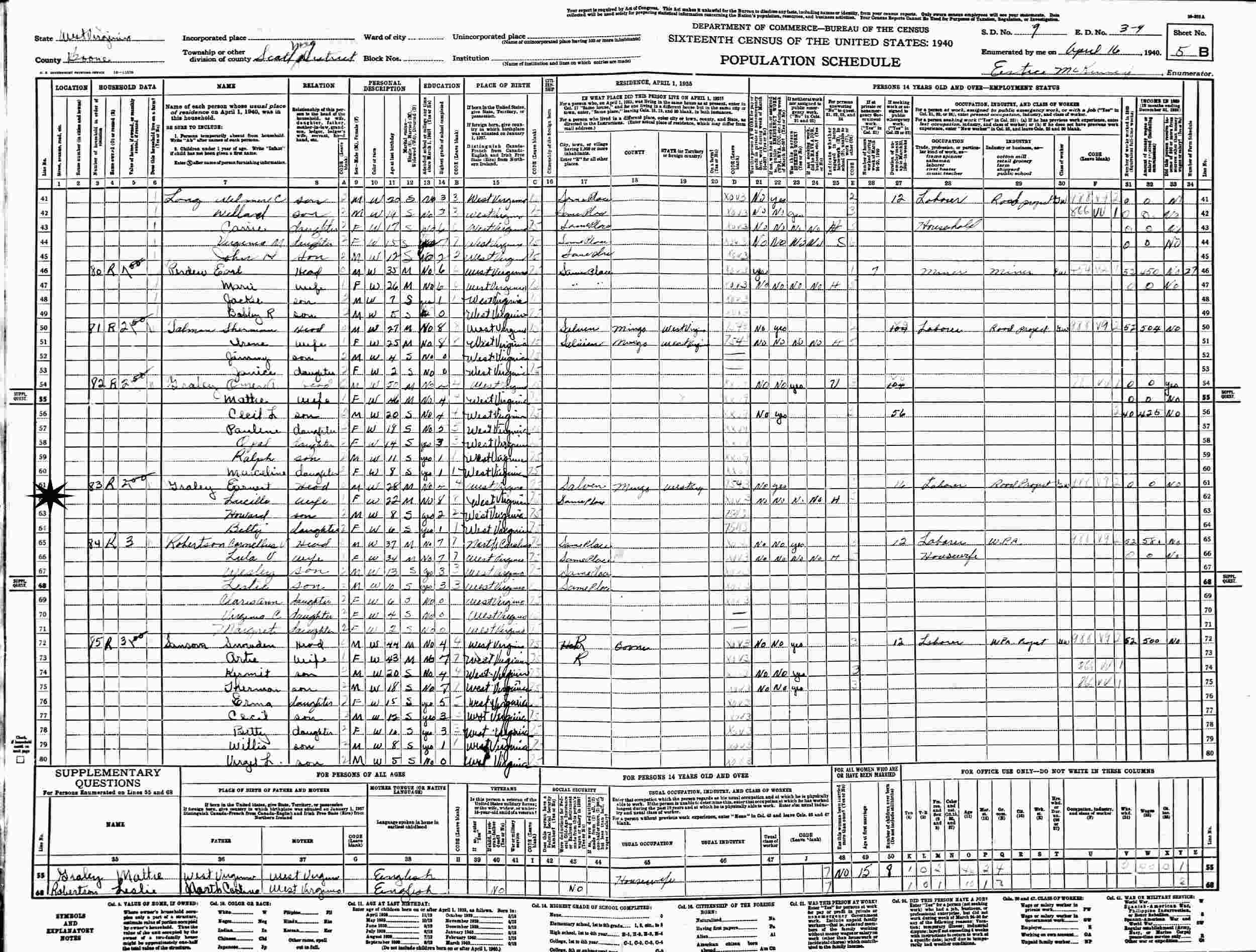 April 16, 1940 - Supervisor's District 9, Enumeration District 3-9, Scott Magisterial District, Boone County, West Virginia.
