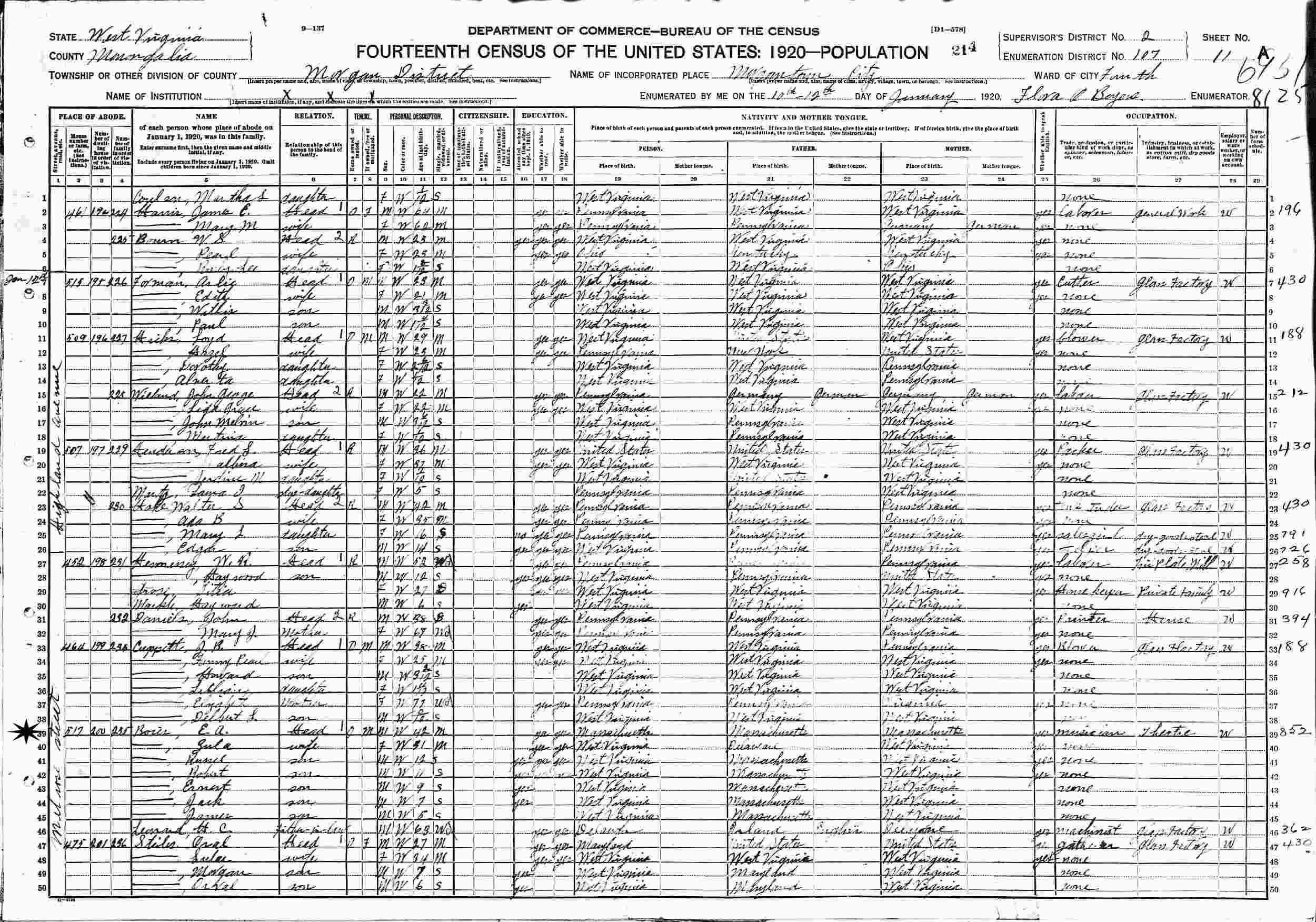 January 10-12, 1920 - 517 Melrose Street, Ward 4, Supervisor's District 2, Enumeration District 107, Morgan District, Monogalia, West Virginia.