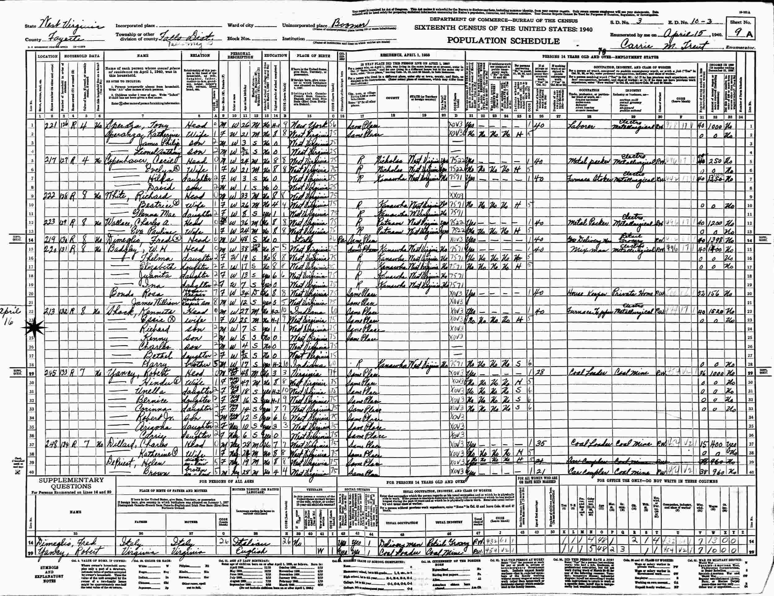 April 15-16, 1940 - Supervisor's District 3, Enumeration District 10-3, Falls Magisterial District, Boomer, Fayetter County, West Virginia.