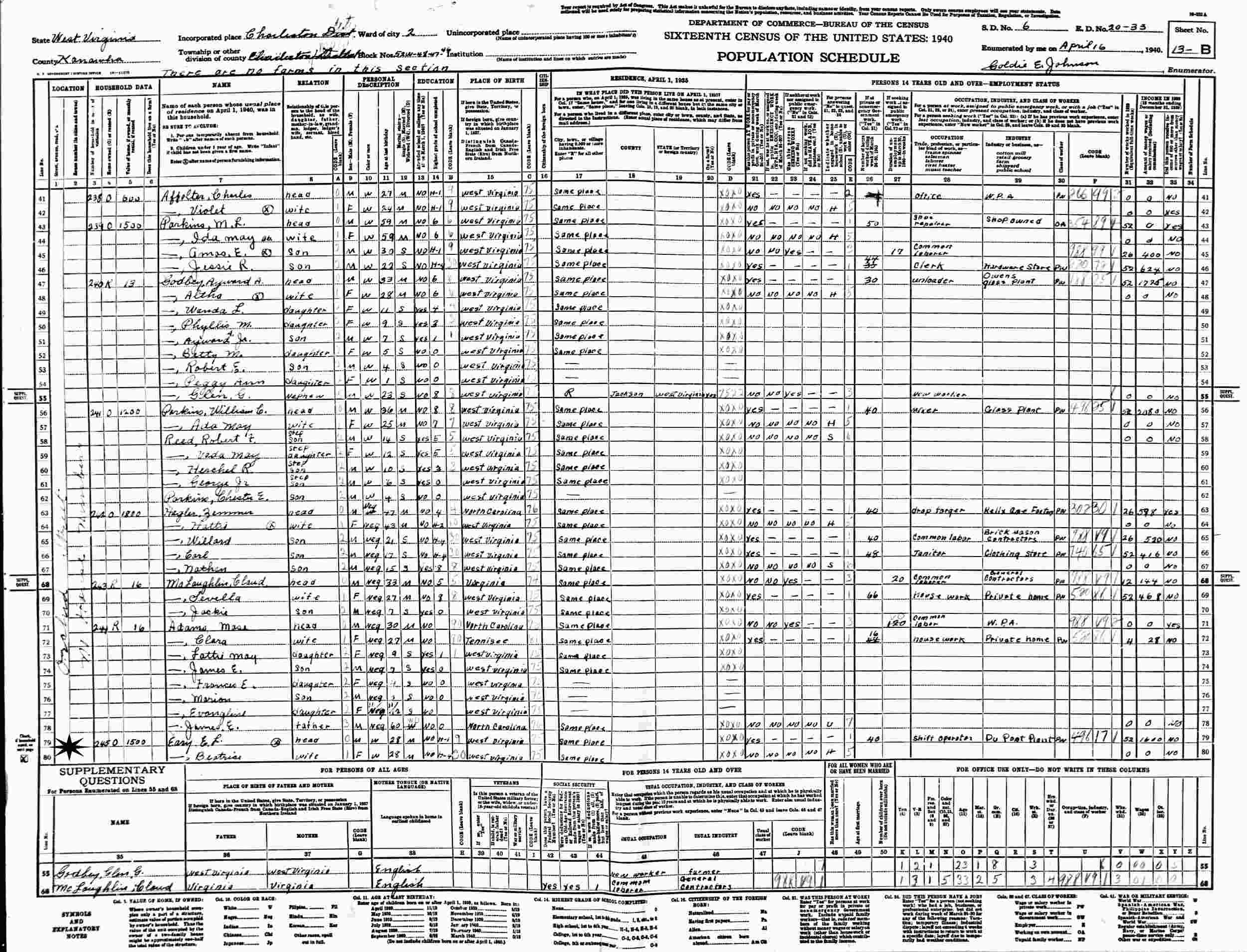 April 16, 1940 - Orchard Street, Ward 2, Blocks 46-52, Supervisor's District 6, Enumeration District 20-33, Charleston, Kanawha County, West Virginia.