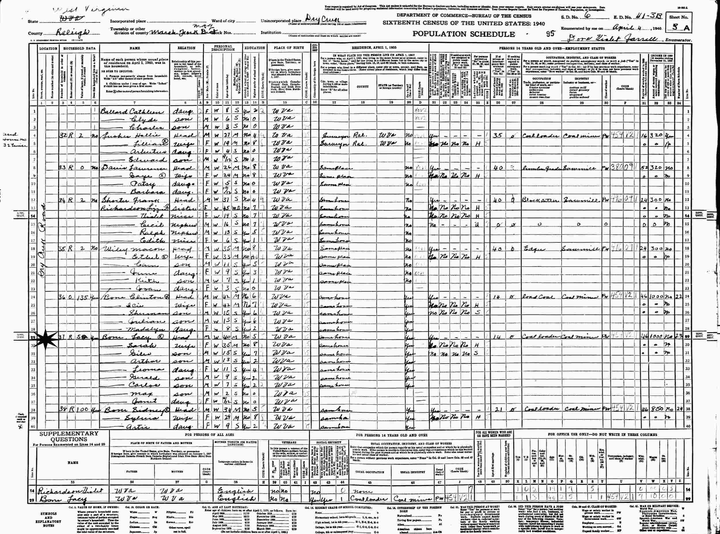 April 4, 1940 - Supervisor's District 6, Enumeration District 41-3B, Marsh Fork District, Dry Creek, Raleigh County, West Virginia.
