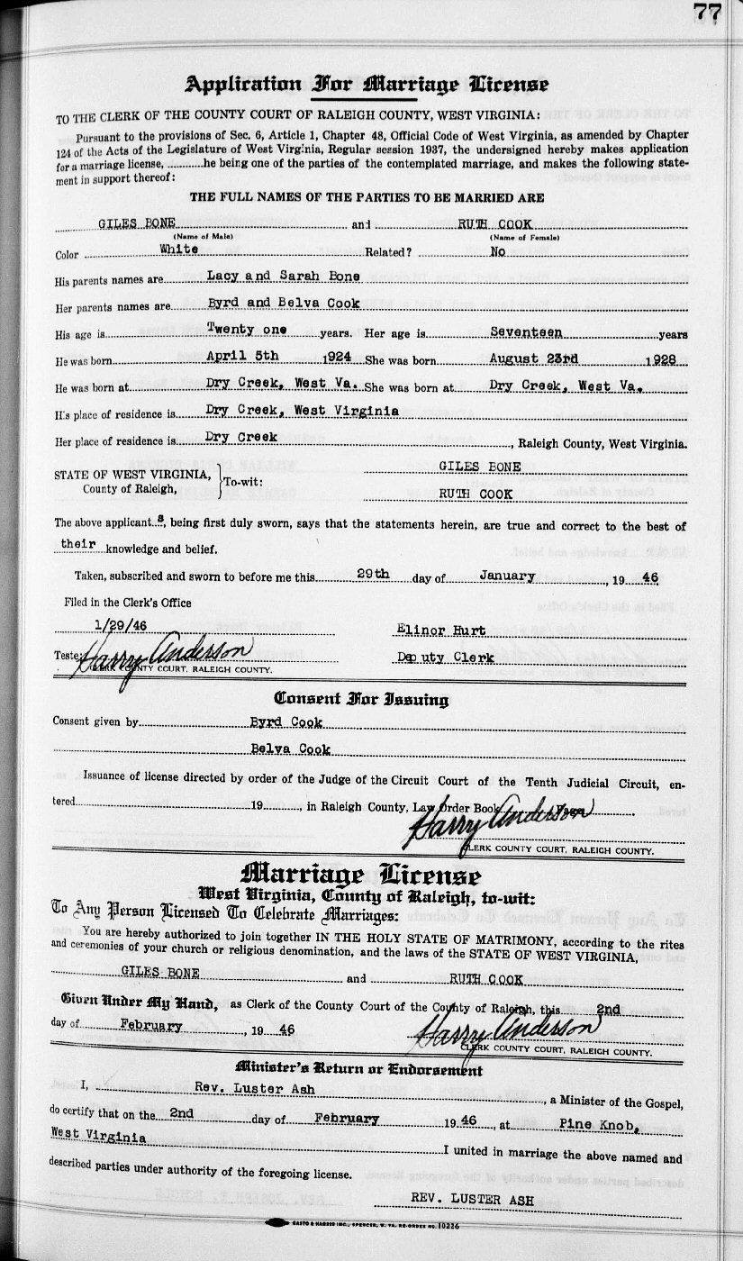 Married: Ruth Cook February 2, 1946 in Pine Knob, Raleigh County, West Virginia. (Marriage License: January 29, 1946.)