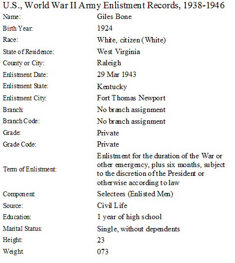 Military Enlistment: March 29, 1943 - WWII - U.S. Army - Fort Thomas, Newport, Campbell County, Kentucky.