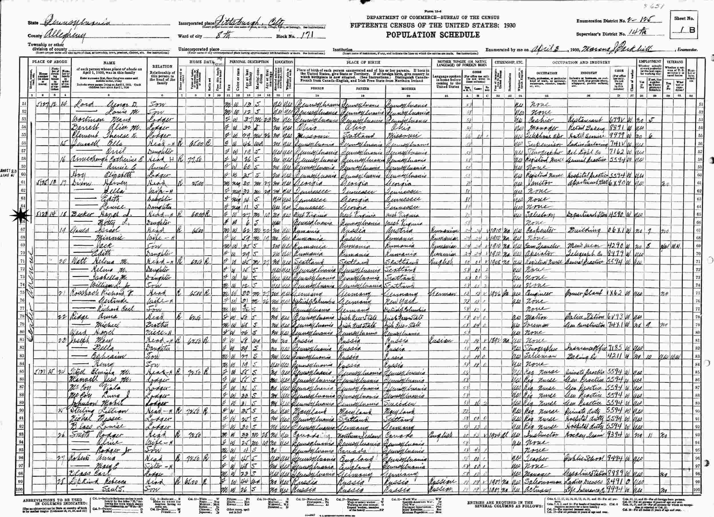 April 3, 1930 - 5123 Center Avenue, Ward 8, Block 171, Supervisor's District 14, Enumeration District 2-125, Pittsburgh, Allegheny County, Pennsylvania.