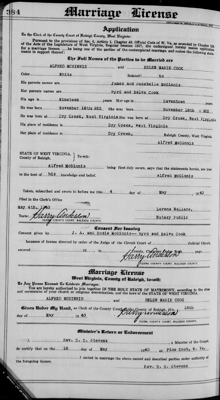 Married: Alfred "Jack" McGinnis May 18, 1940 in Pine Knob, Raleigh County, West Virginia. (Marriage License: May 04, 1940.)
