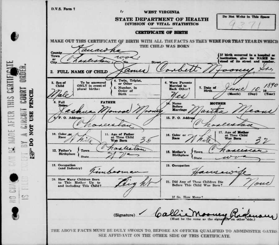 Born: June 10, 1890 in Charleston, Kanawha County, West Virginia.