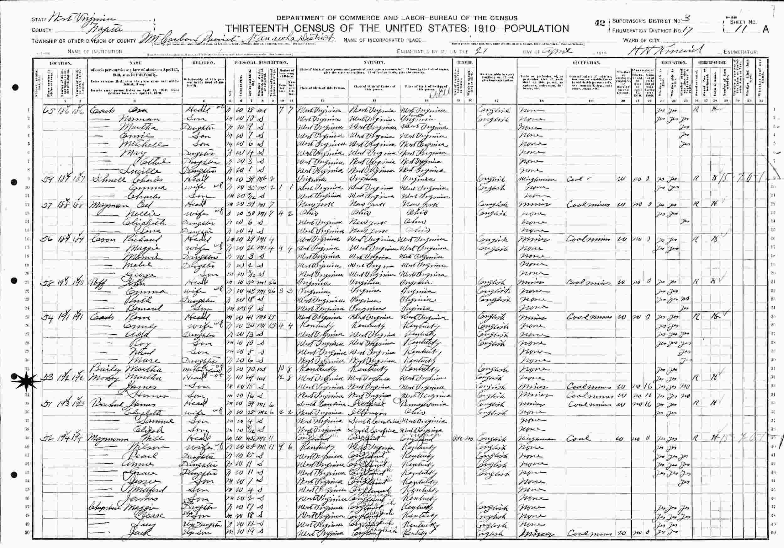April 21 1910 - Supervisor's District 3, Enumeration District 17, Mt Cabon Precinct, Kanawha District, Fayette County, West Virginia.