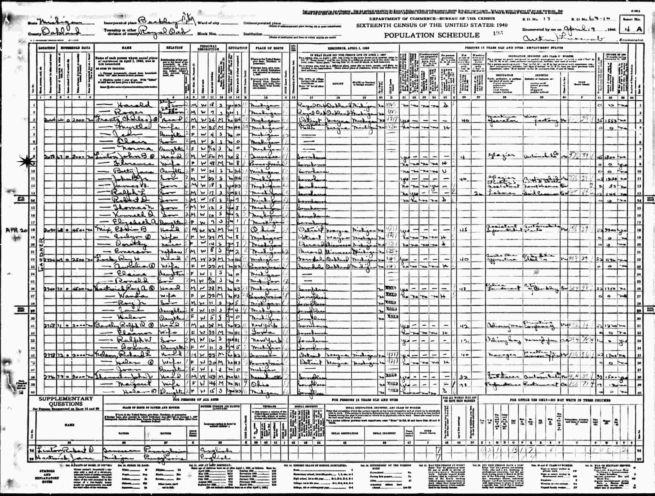 April 19-20, 1940 - 2678 Gardner, Supervisor's District 17, Enumeration District 63-10, Royal Oak, Berkley City, Oakland County, Michigan.