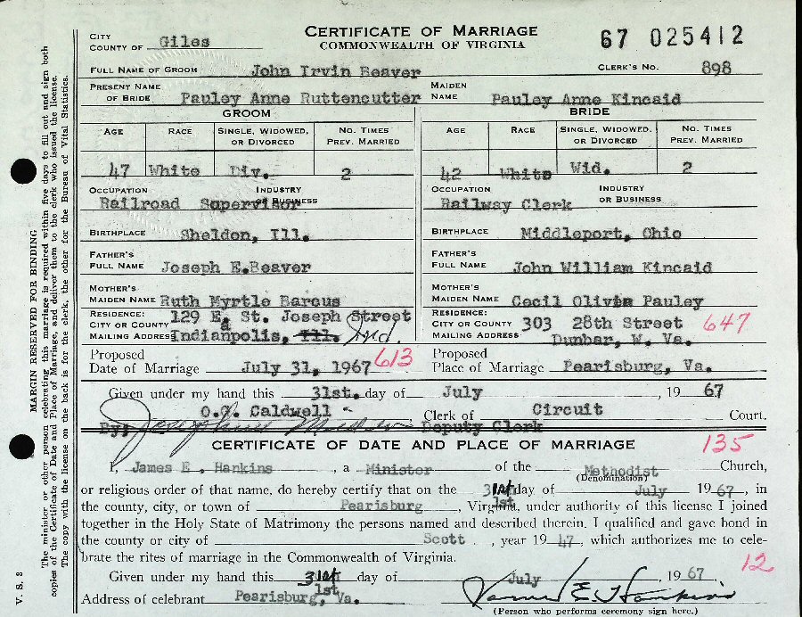 Married: Pauley Ann Kincaid July 31, 1967 in Pearisburg, Giles County, Virginia.