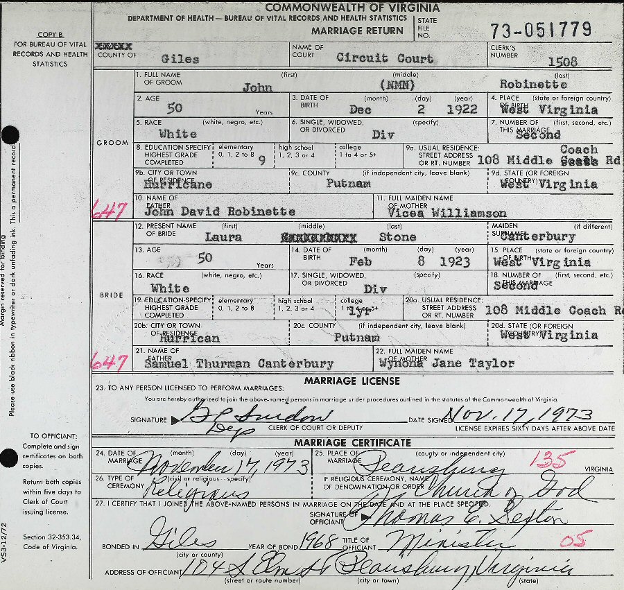 (2) Laura Canterbury November 17, 1973 in Pearisburg, Giles County, Virginia.