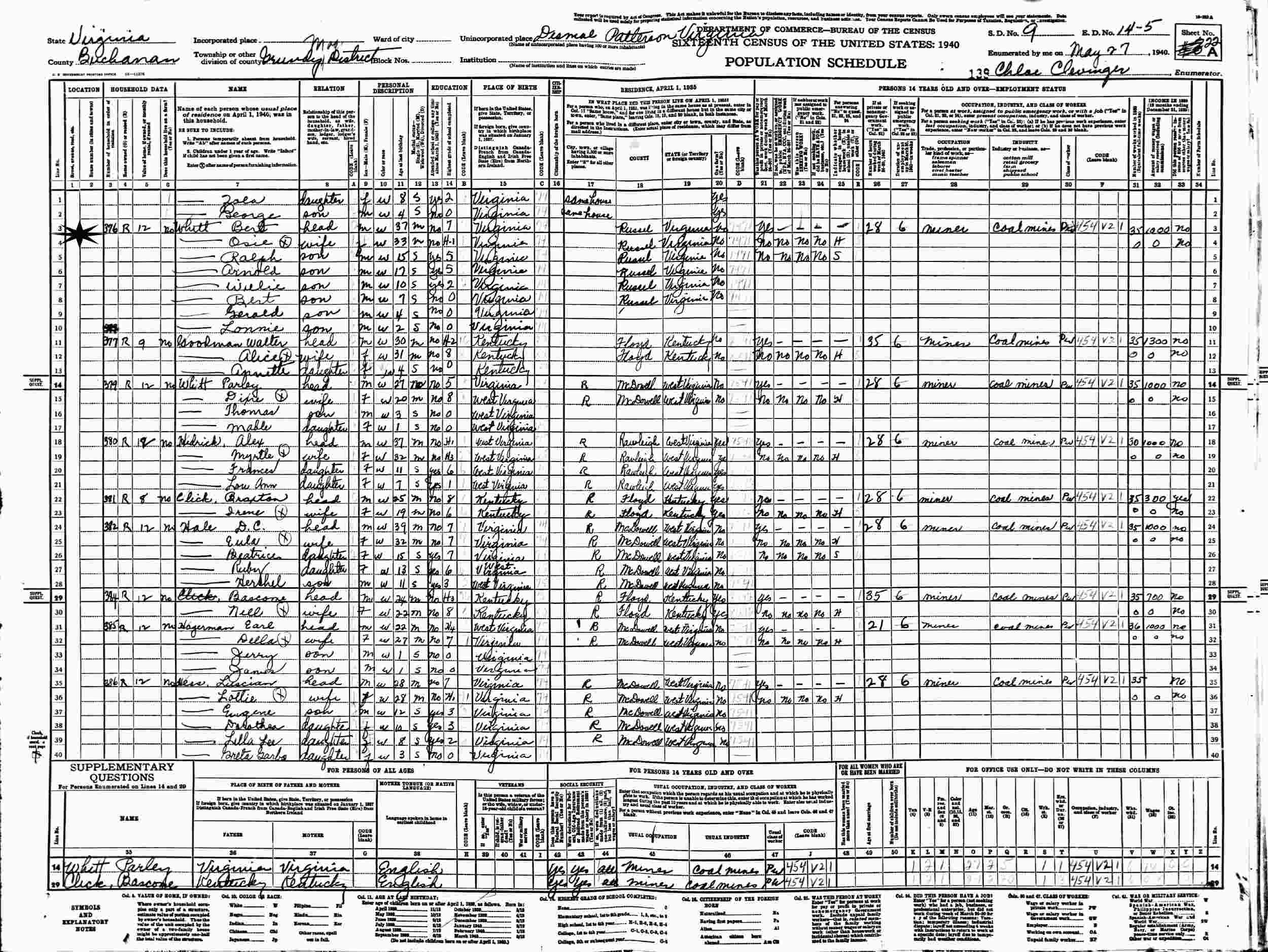 May 27, 1940 - Supervisor's District 9, Enumeration District 14-5, Grundy Magisterial District, Desmal Patterson, Buchanan County, Virginia.