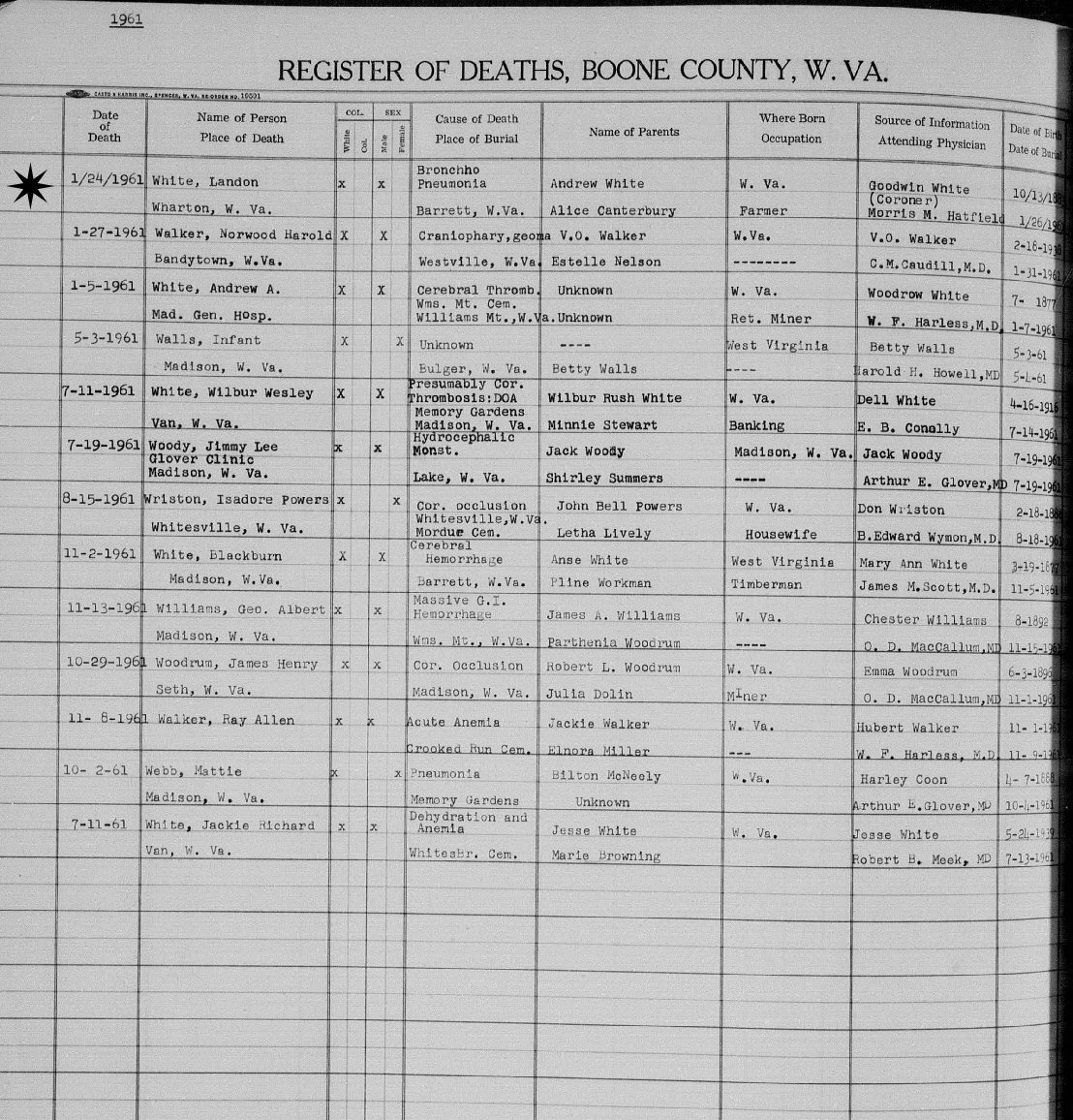 Died: January 24, 1961 in Wharton, Boone County, West Virginia.