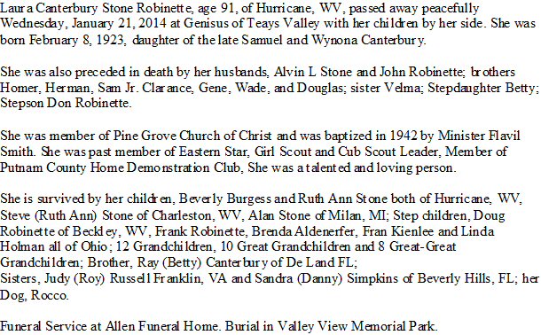 Married: (1) Alvin L Stone May 29, 1942 at home of father, Samuel Canterbury, Putnam County, West Virginia.