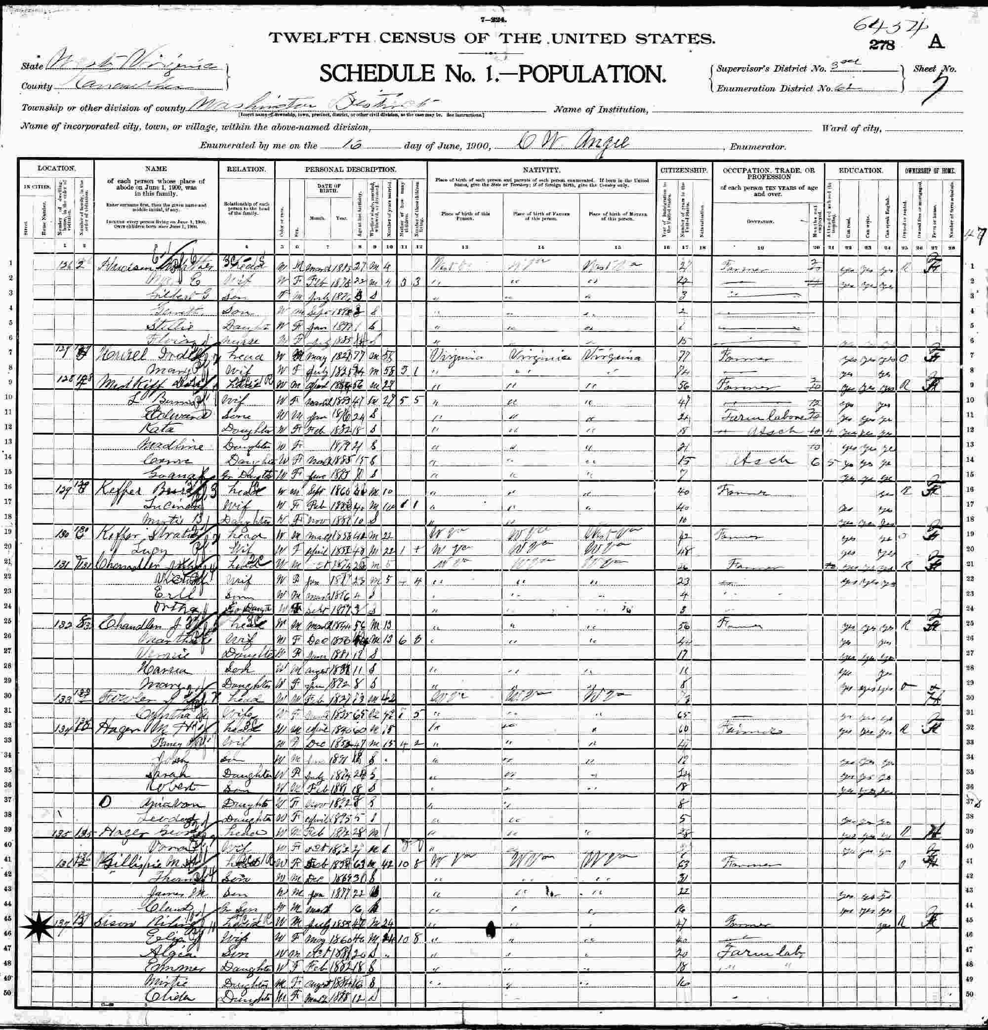 June 16, 1900 - Supervisor's District 3, Enumeration District 62, Washington District, Kanawha County, West Virginia.
