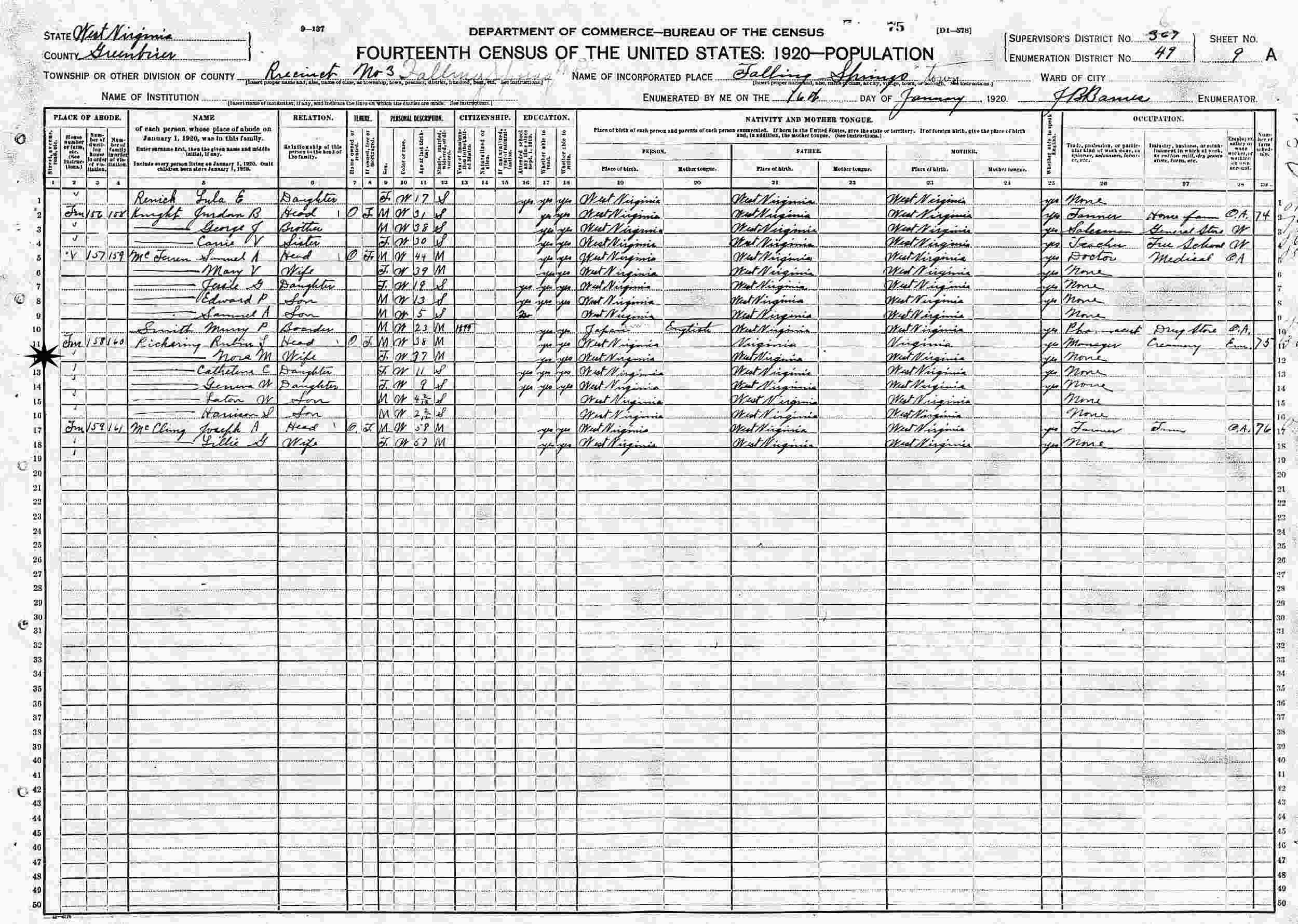 January 16, 1920 - Precinct 3, Supervisor's District 367 (crossed out to 6), Enumeration District 49, Falling Springs, Greenbrier County, West Virginia.