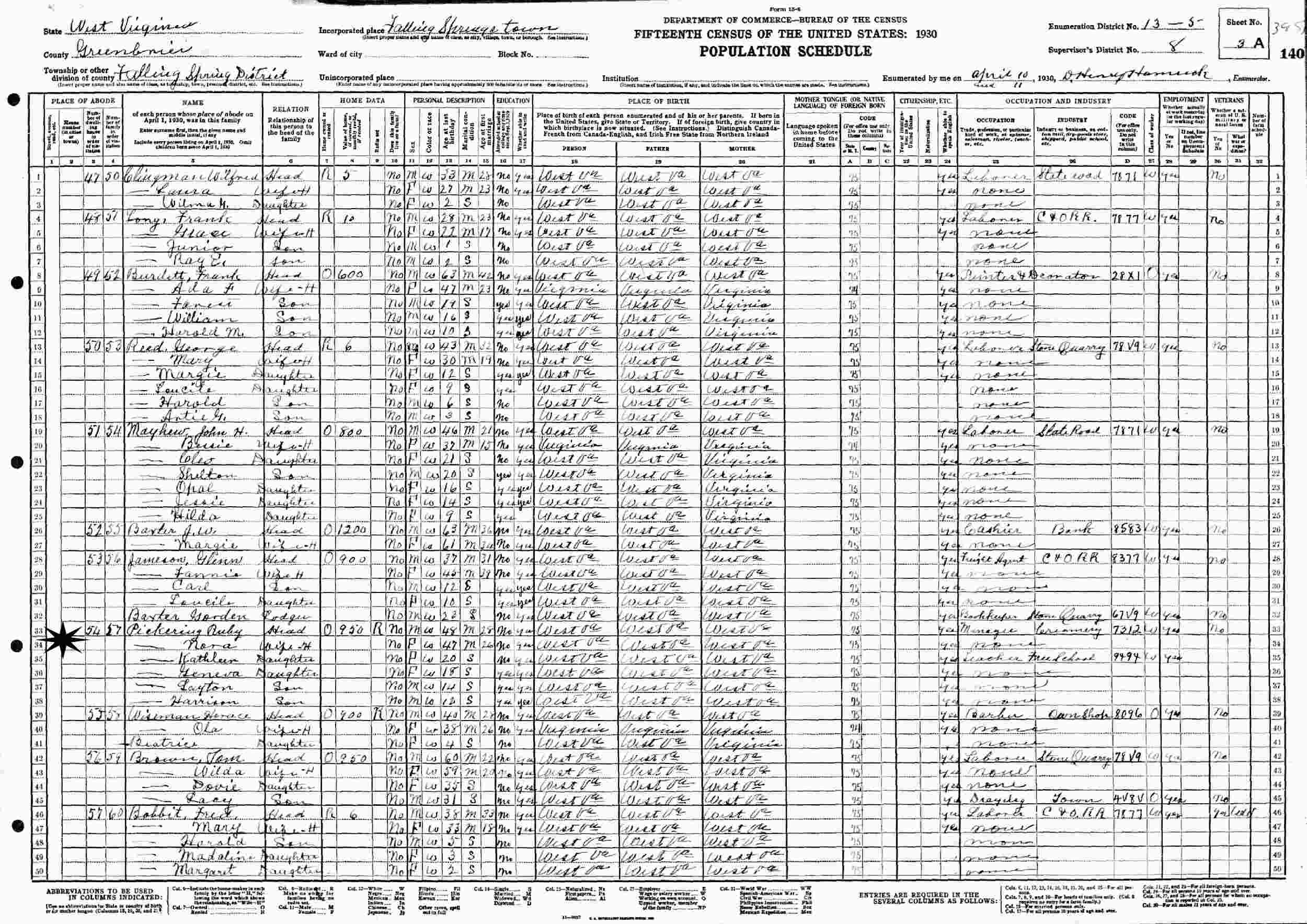 April 10-11, 1930 - Supervisor's District 8, Enumeration District 13-5, Falling Springs Town, Greenbrier County, West Virginia.