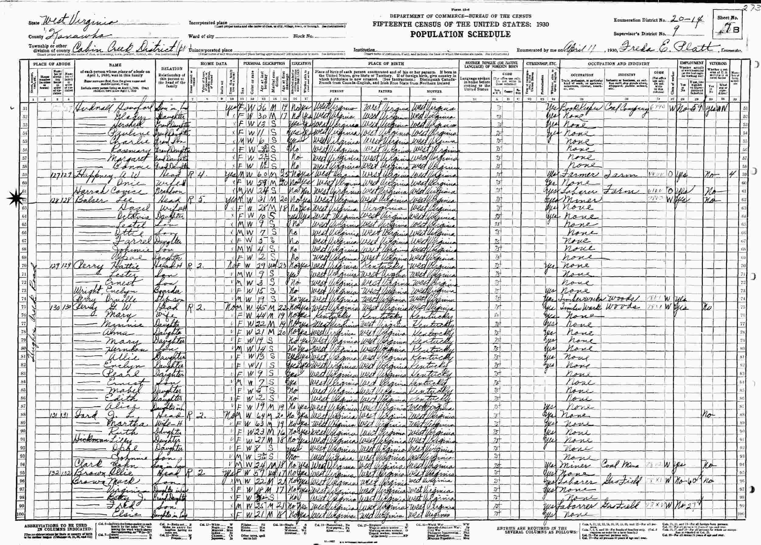 April 11, 1930 - Hughes Creek Road, Supervisor's District 9, Enumeration District 20-14, Cabin Creek District, Kanawha County, West Virginia.