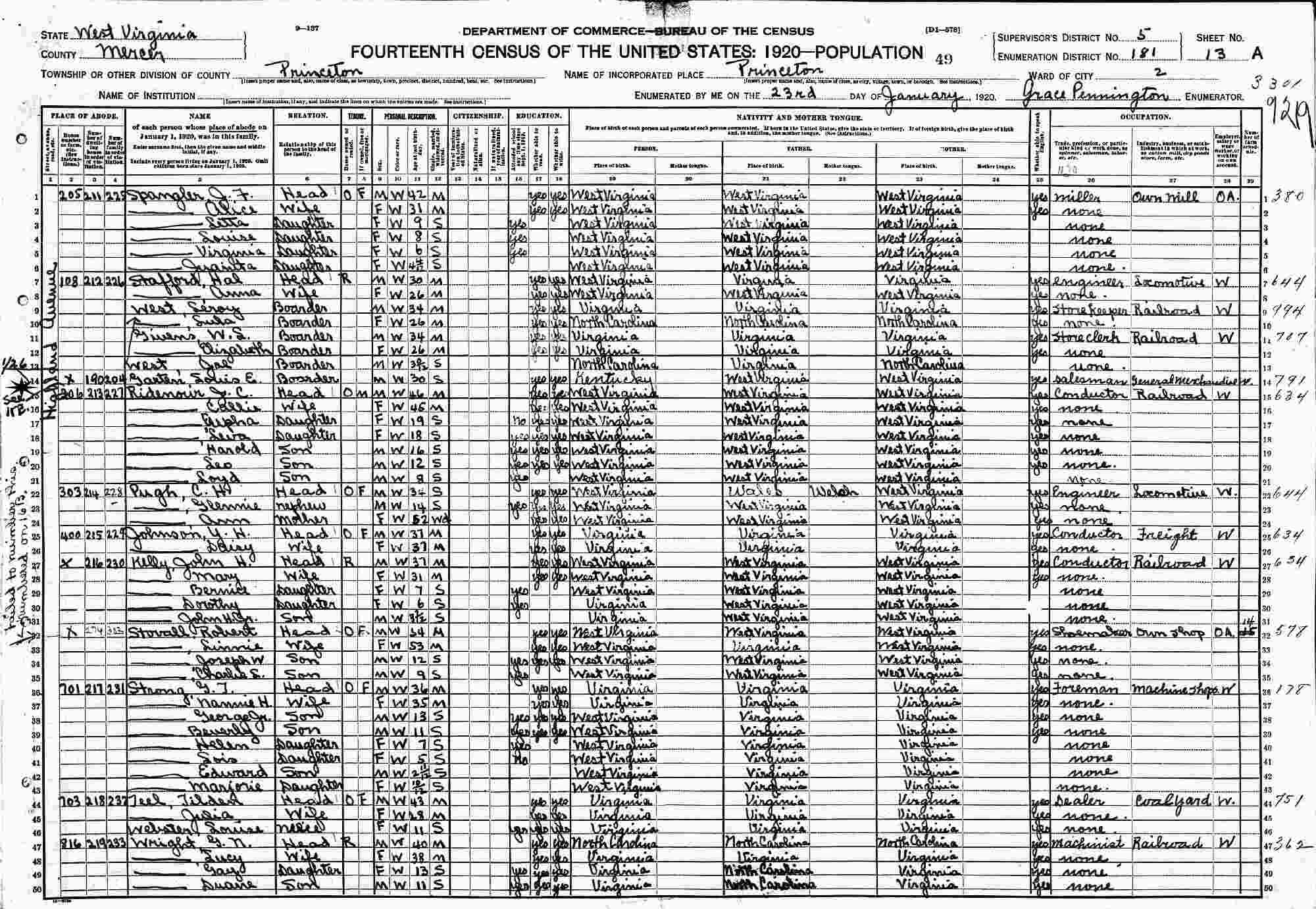 January 23, 1920 - 206 Highland Avenue, Ward 2, Supervisor's District 5, Enumeration District 181, Princeton, Mercer County, West Virginia.