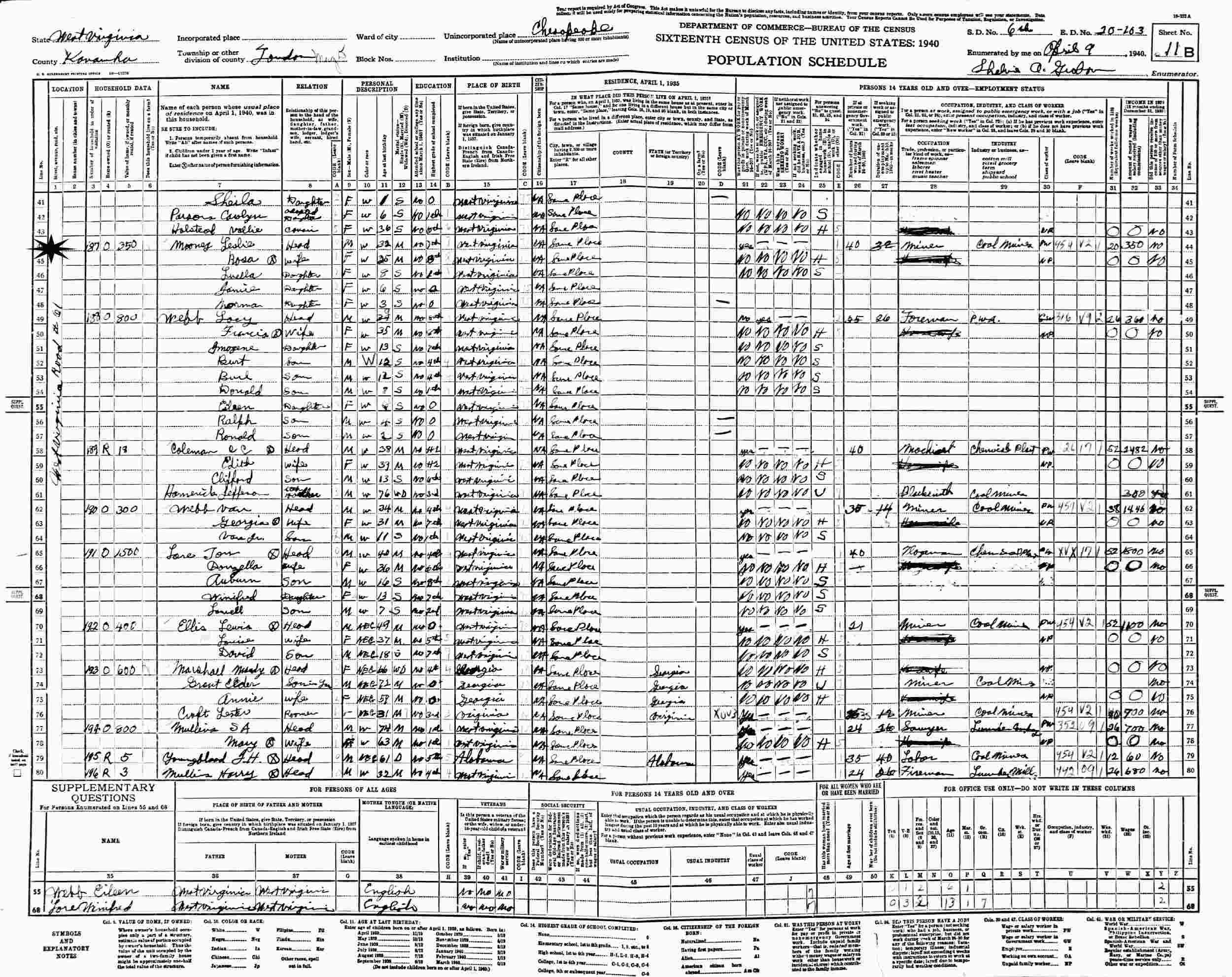 April 9, 1940 - West Virginia Road #61, Supervisor's District 6, Enumeration District 20-103, Loudon Magisterial District, Chesapeake, Kanawha County, West Virginia.