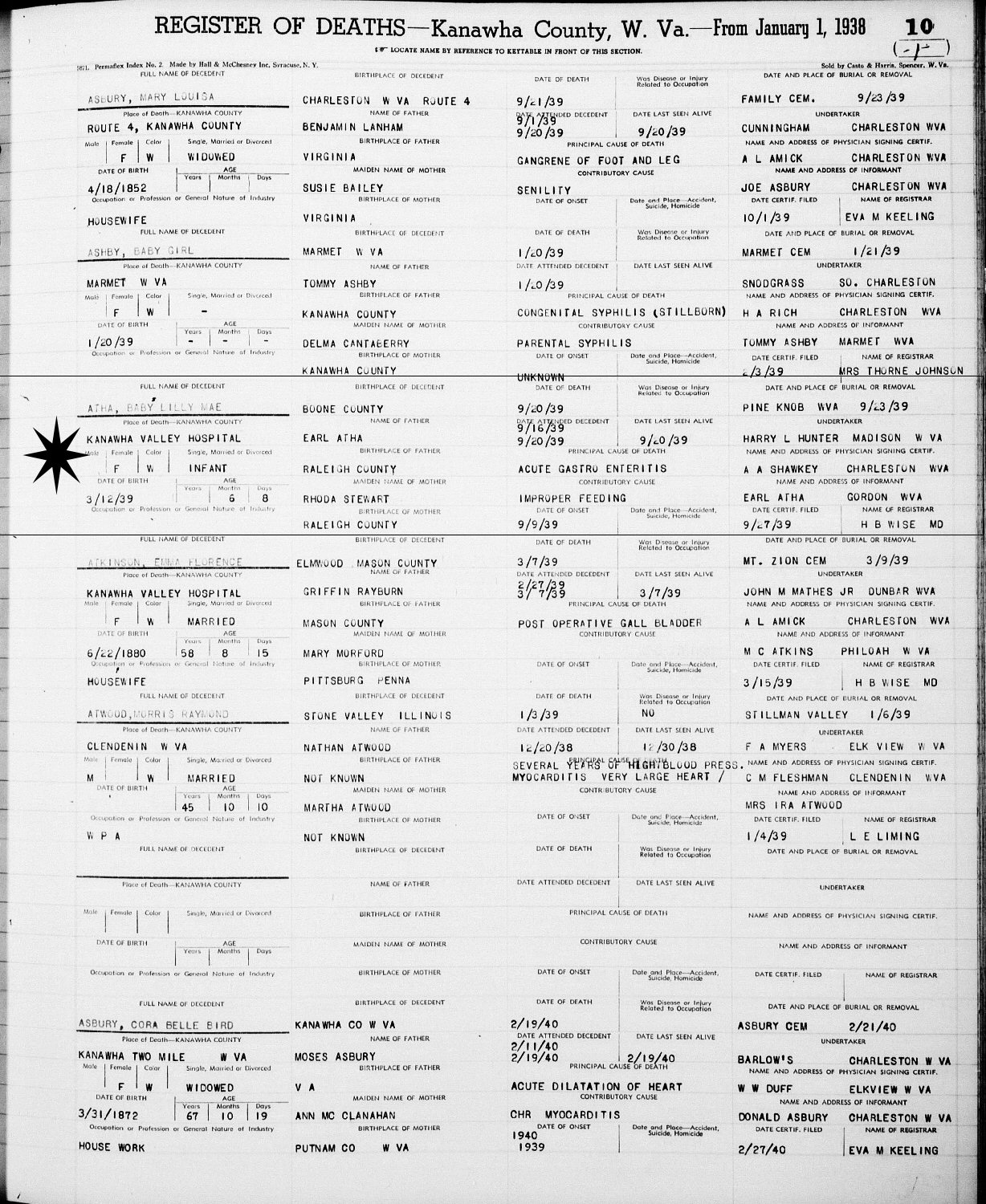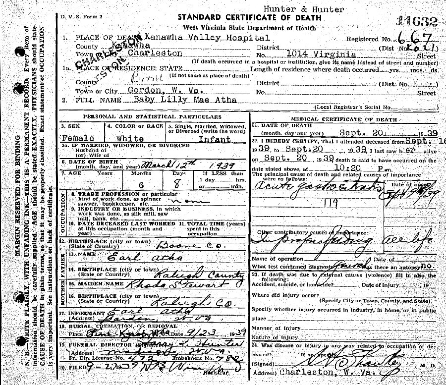 Notes for LILY MAE ATHA: Daughter of Lacy Earl and Rhoda (Stewart) Atha. Born: March 12, 1939 in Crook District, Gordon, Boone County, West Virginia. Died: September 20, 1939 in Kanawha Valley Hospital, Kanawha County, West Virginia.