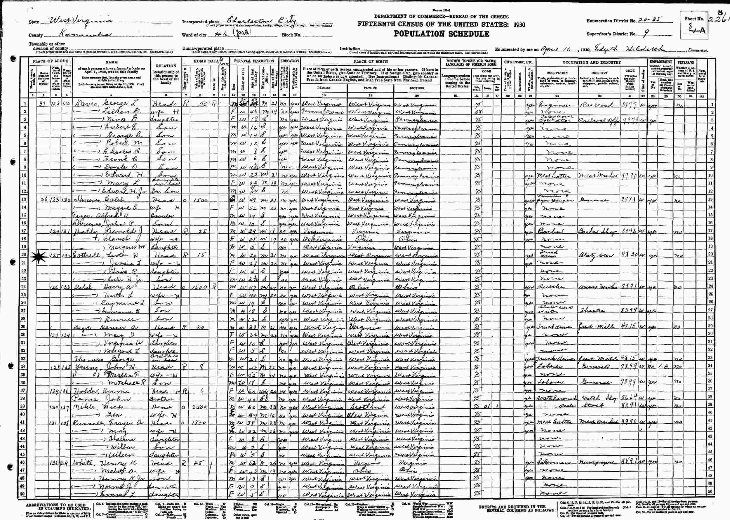 April 16, 1930 - Ward 6, Supervisor's District 9, Enumeration District 20-35, Charleston, Kanawha County, West Virginia.