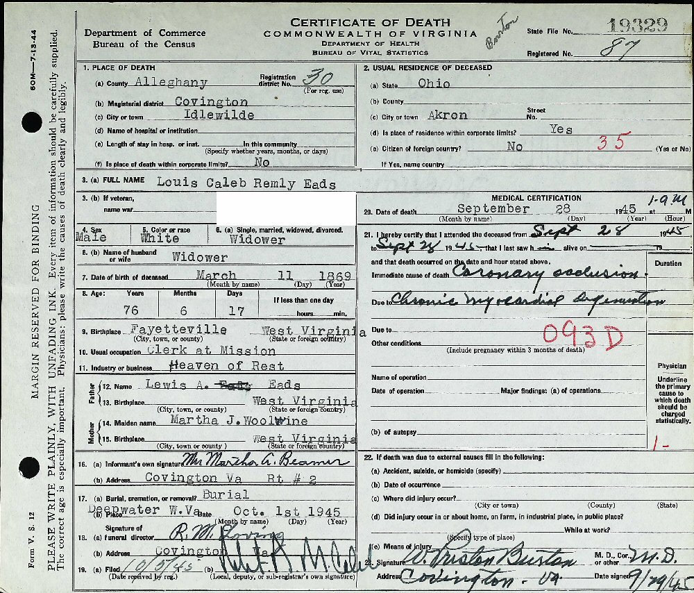 Buried: Eads Cemetery, Fayette County, West Virginia.