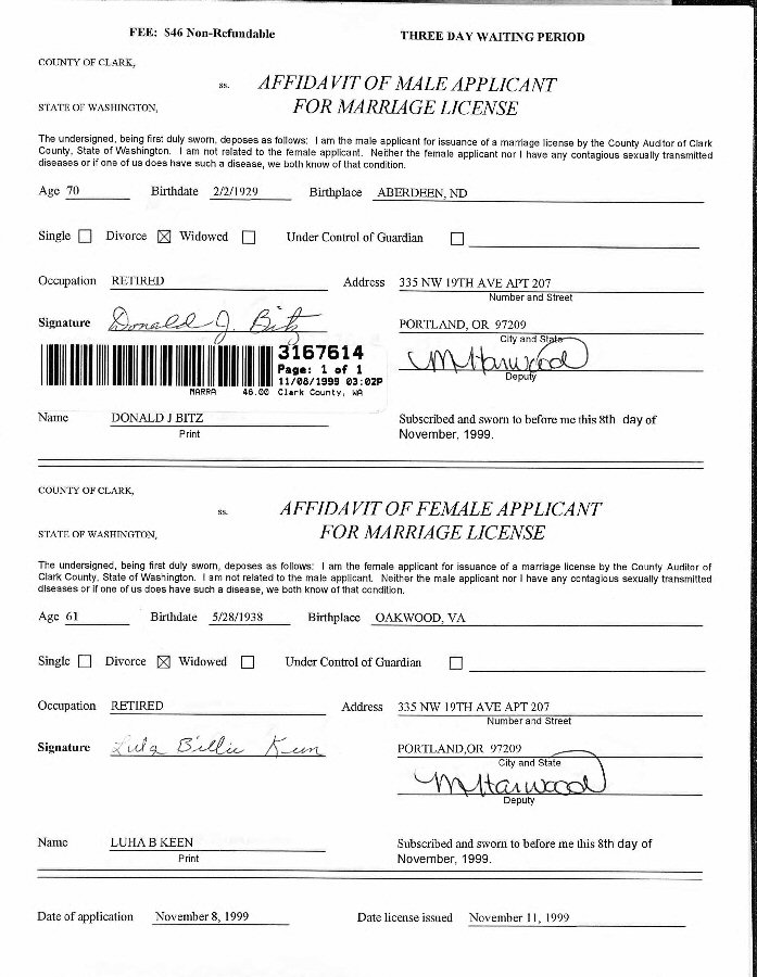 (8) Donald Jerome Bitz November 11, 1999 in Portland, Multnomah County, Oregon. (Marriage License: November 11, 1999.) (Marriage Verified with Marriage Certificate.)