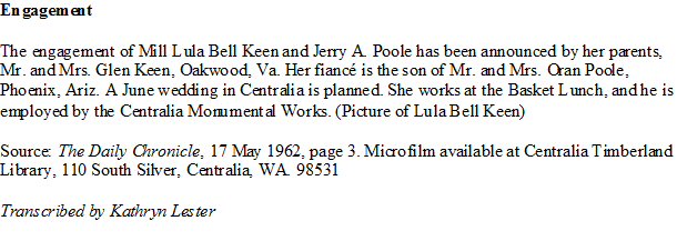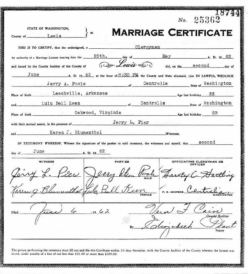 (2) Jerry Alton Poale June 2, 1962 in Lewis County, Washington. (Marriage verified w/Certificate.)