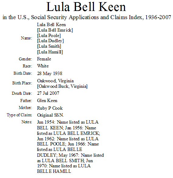 Notes for LULA BELL KEEN EMRICK POALE DUDLEY SMITH HAMILL ELY LAKEY BITZ: