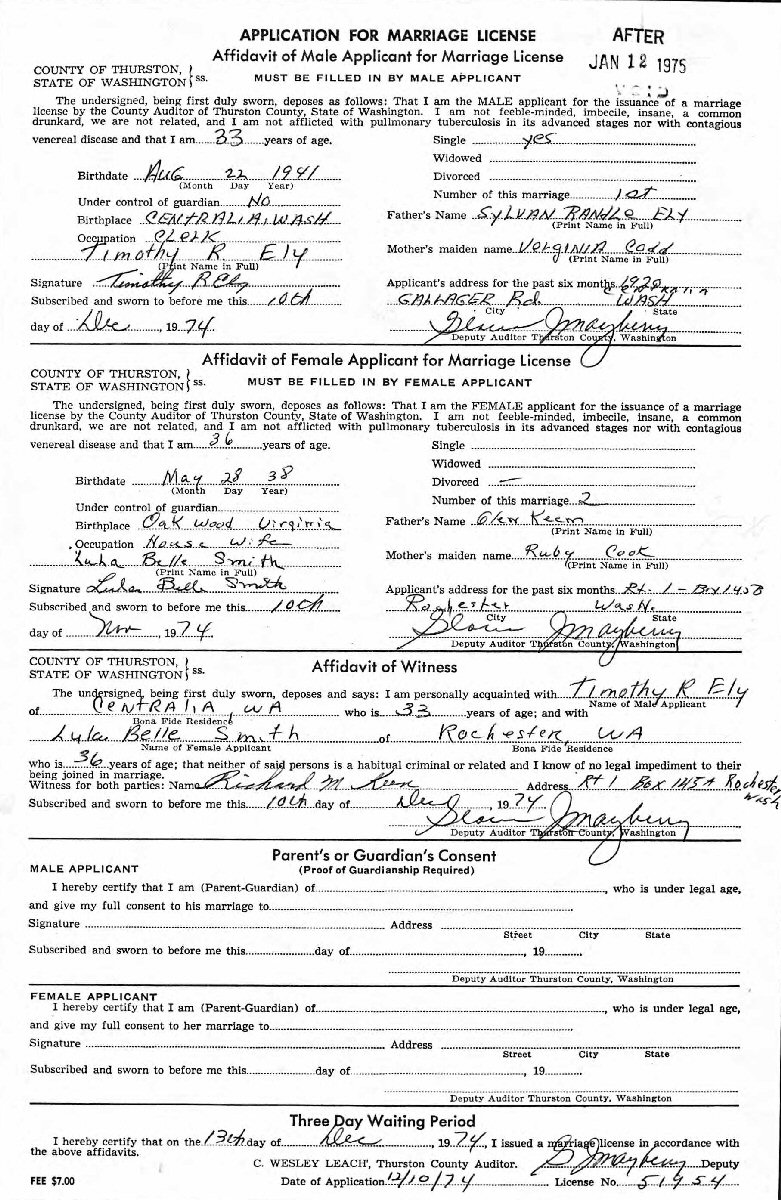 (6) Timothy R Ely About December 10, 1974 in Thurston County, Washington. (Did they marry or just get marriage license? He not listed in social security application index.)