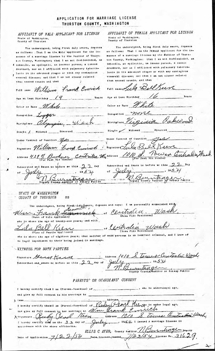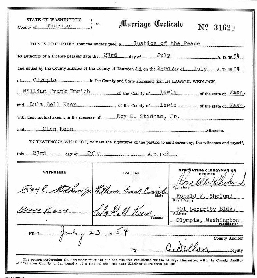 Married: (1) William Frank Emrick Jr. July 23, 1954 in Oylmpia, Thurston County, Washington. (Marriage License: July 22, 1954.) (Divorce.) (Marriage verified w/certificate.)