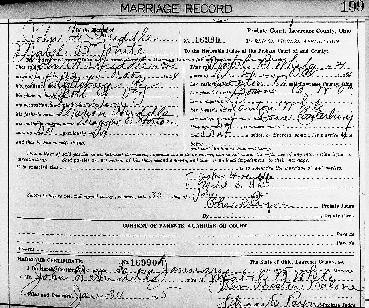 Married: John Franklin Huddle, Sr. January 30, 1925 in Lawrence County, Ohio.