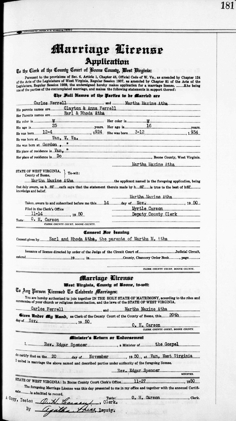 Married: Carlos Clayton Ferrell November 14, 1950 in Van, Boone County, West Virginia. (Divorce: Jul 16, 1971, Cuyahoga County, Ohio.)