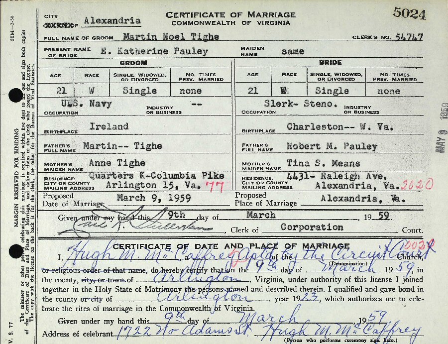 Married: Emma Katherine Pauley March 9, 1959 in Arlington, Virginia.