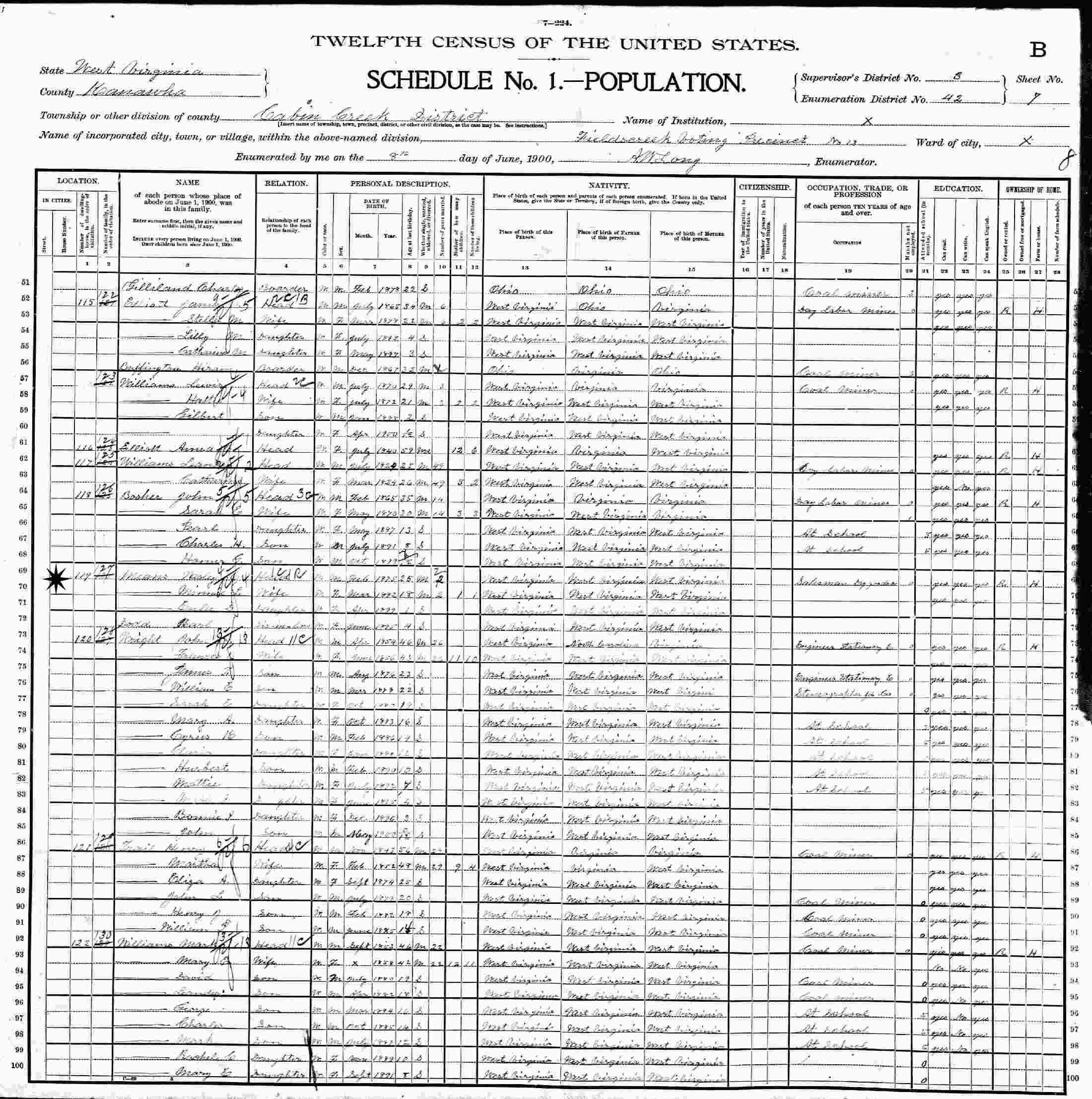 June 8, 1900 - Cabin Creek District, Fields Creek Voting District No. 13, Supervisor's District 3, Enumeration District 42, Kanawha County, West Virginia.