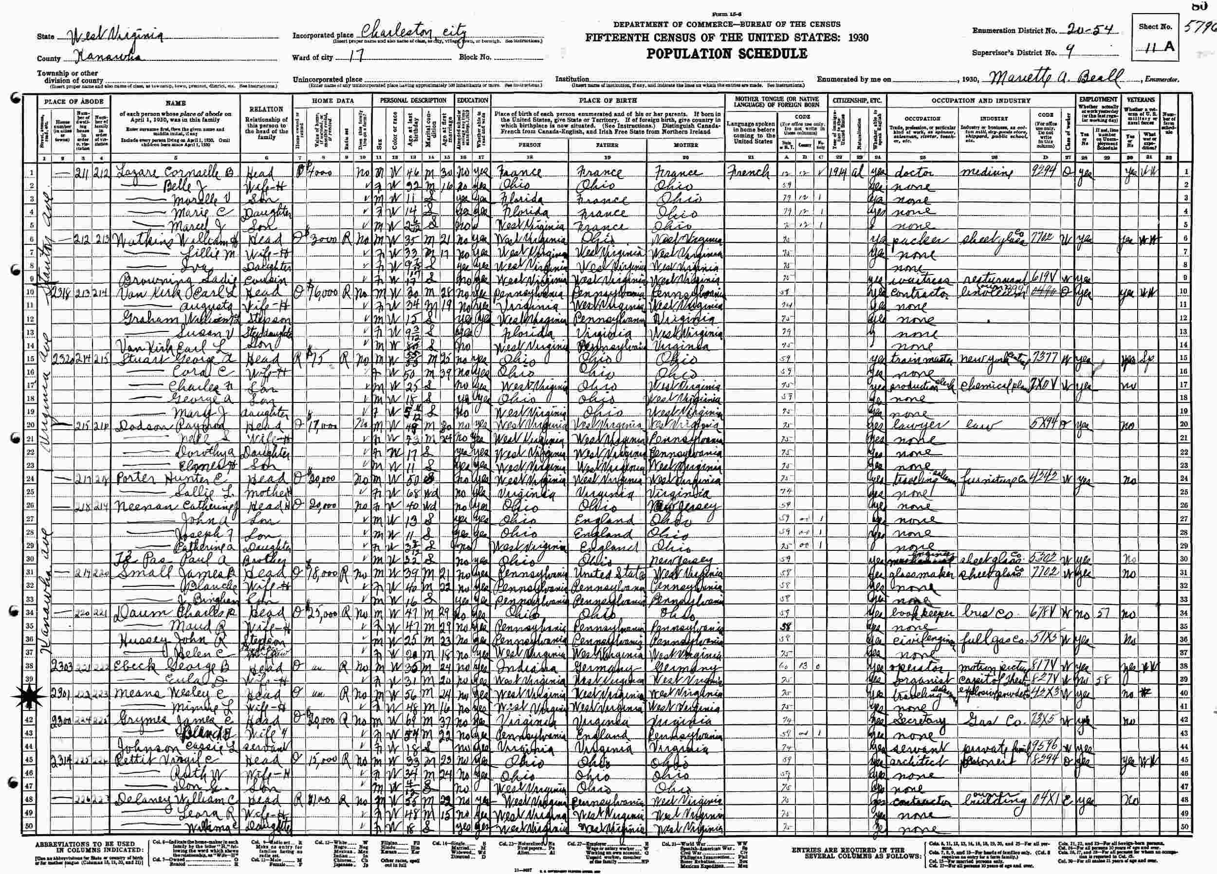 1930 - 2301 Kanawha Avenue, Ward 17, Supervisor's District 9, Enumeration District 20-54, Kanawha County, West Virginia.