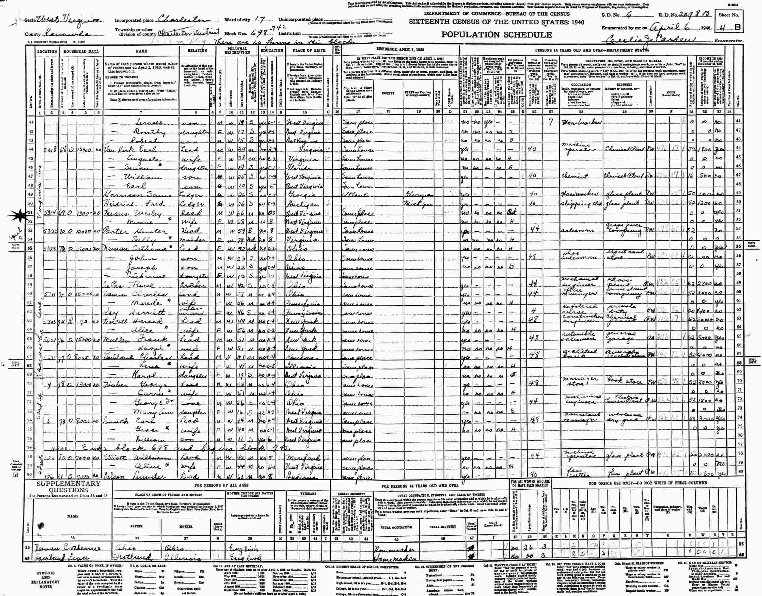 April 8, 1940 - 5314 Virginia Avenue, Blocks 698-742, Ward 17, Supervisor's District 6, Enumeration District 20-78B, Loudon Magisterial District, Charleston, Kanawha County, West Virginia.