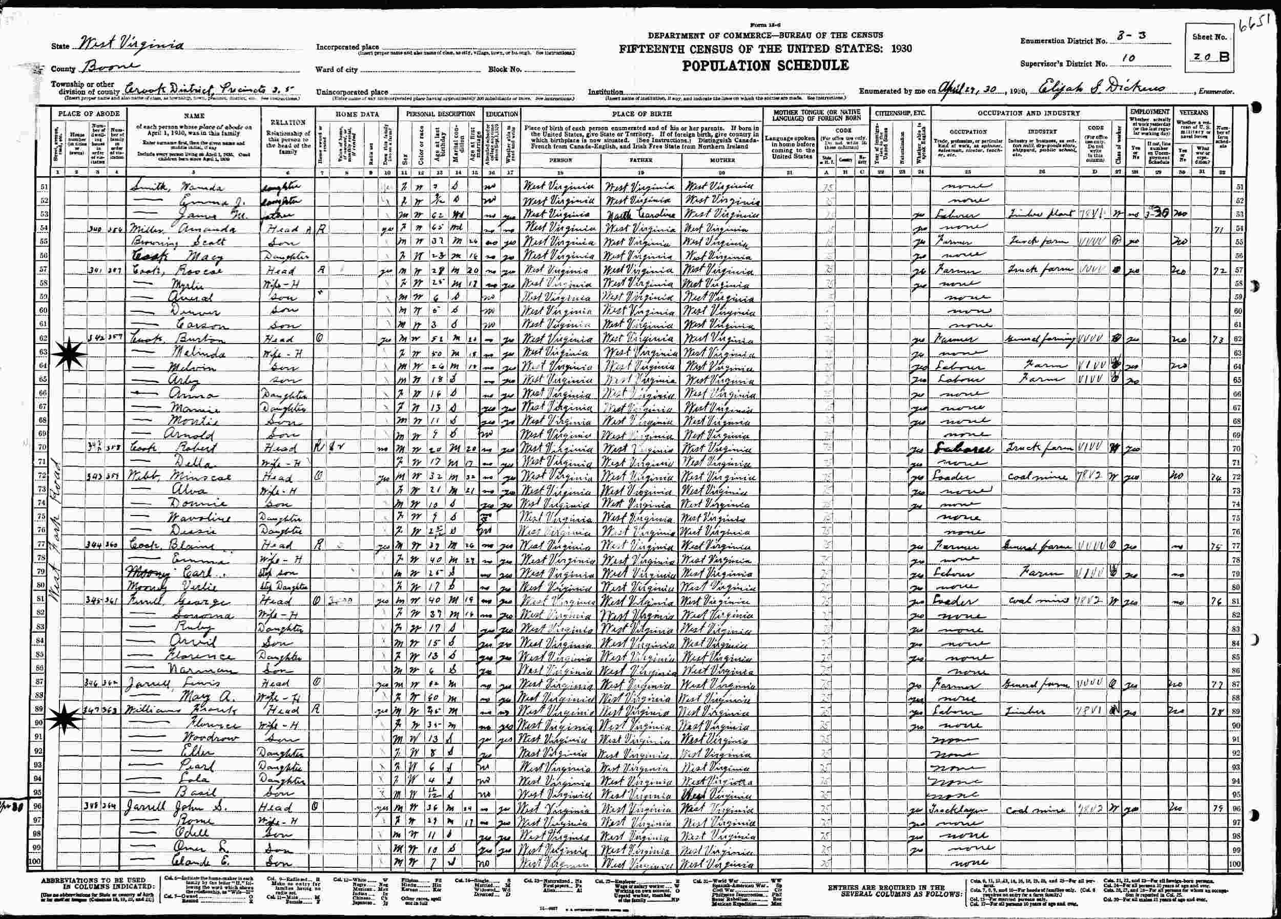 April 30, 1930 - West Fork Road, Crook District, Precincts 2, 5, Supervisor's District 10, Enumeration District 3-3, Boone County, West Virginia.