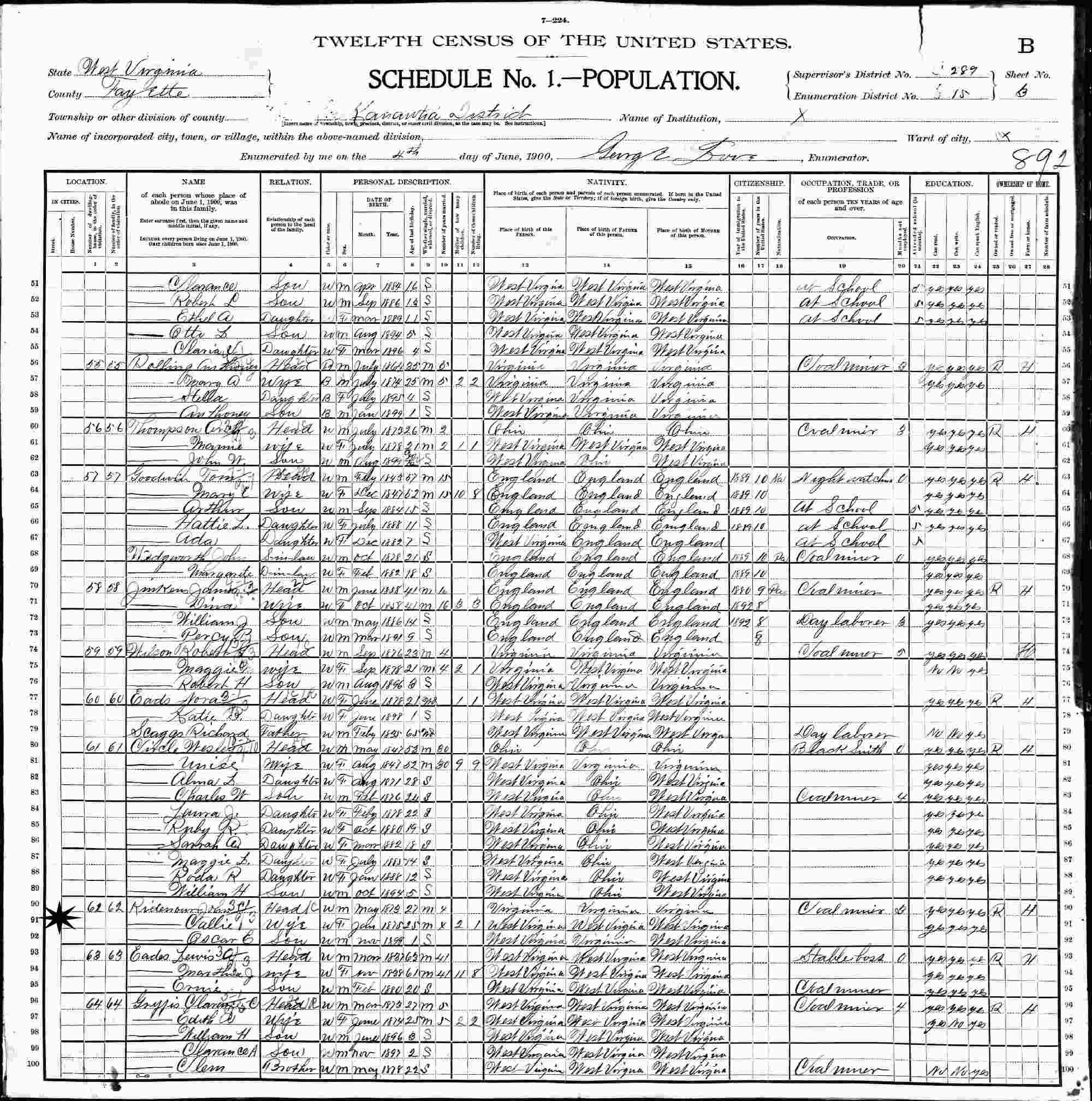 June 4, 1900 - Supervisor's District 289, Enumeration District 15, Kanawha District, Fayette County, West Virginia.