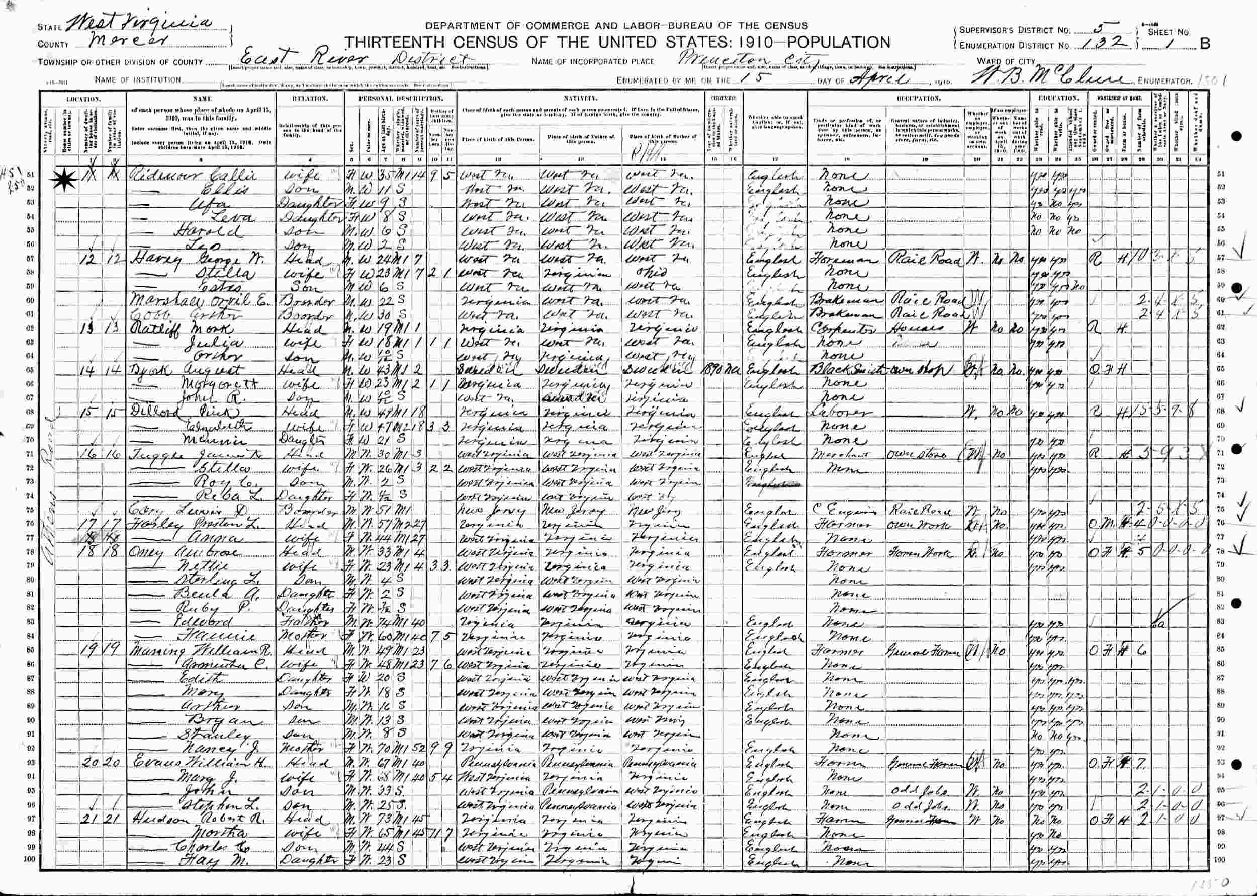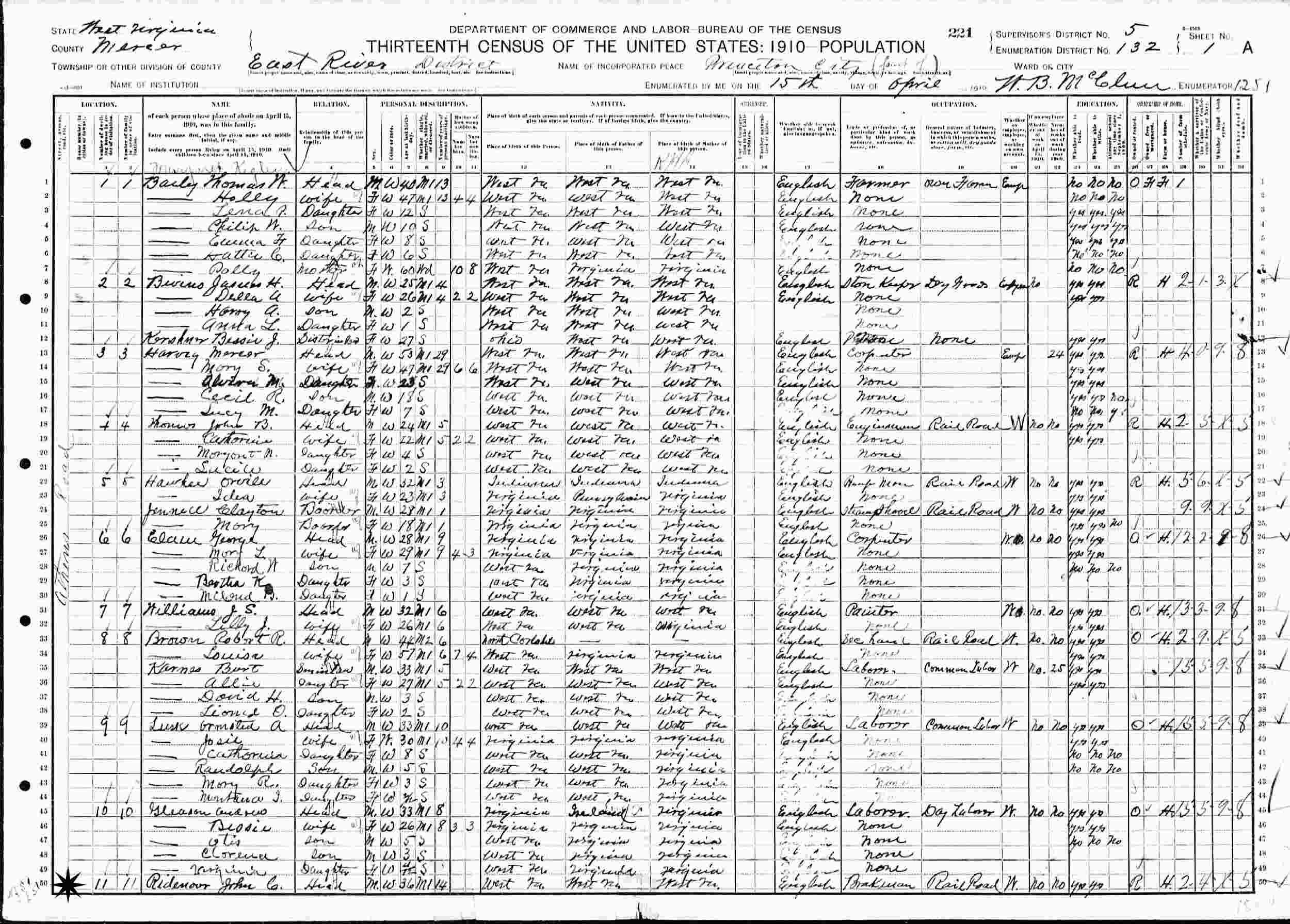 April 15, 1910 - Supervisor's District 5, Enumeration District 132, West River District, Princeton City, Mercer County, West Virginia.