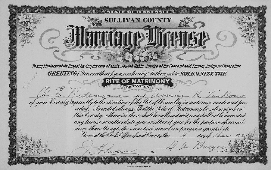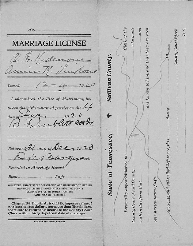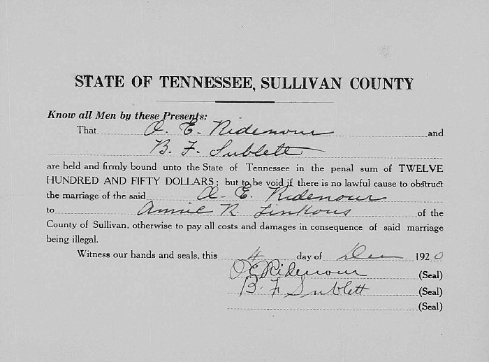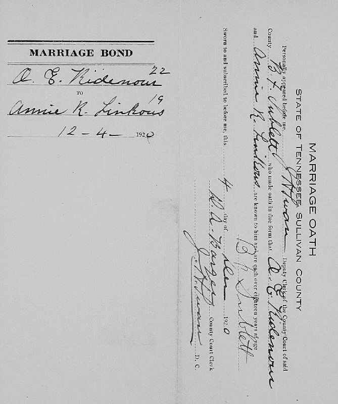 Married: Anna "Annie" Ruth Linkous December 4, 1920 in Sullivan County, Tennessee. (Marriage Bond: December 4, 1920.)
