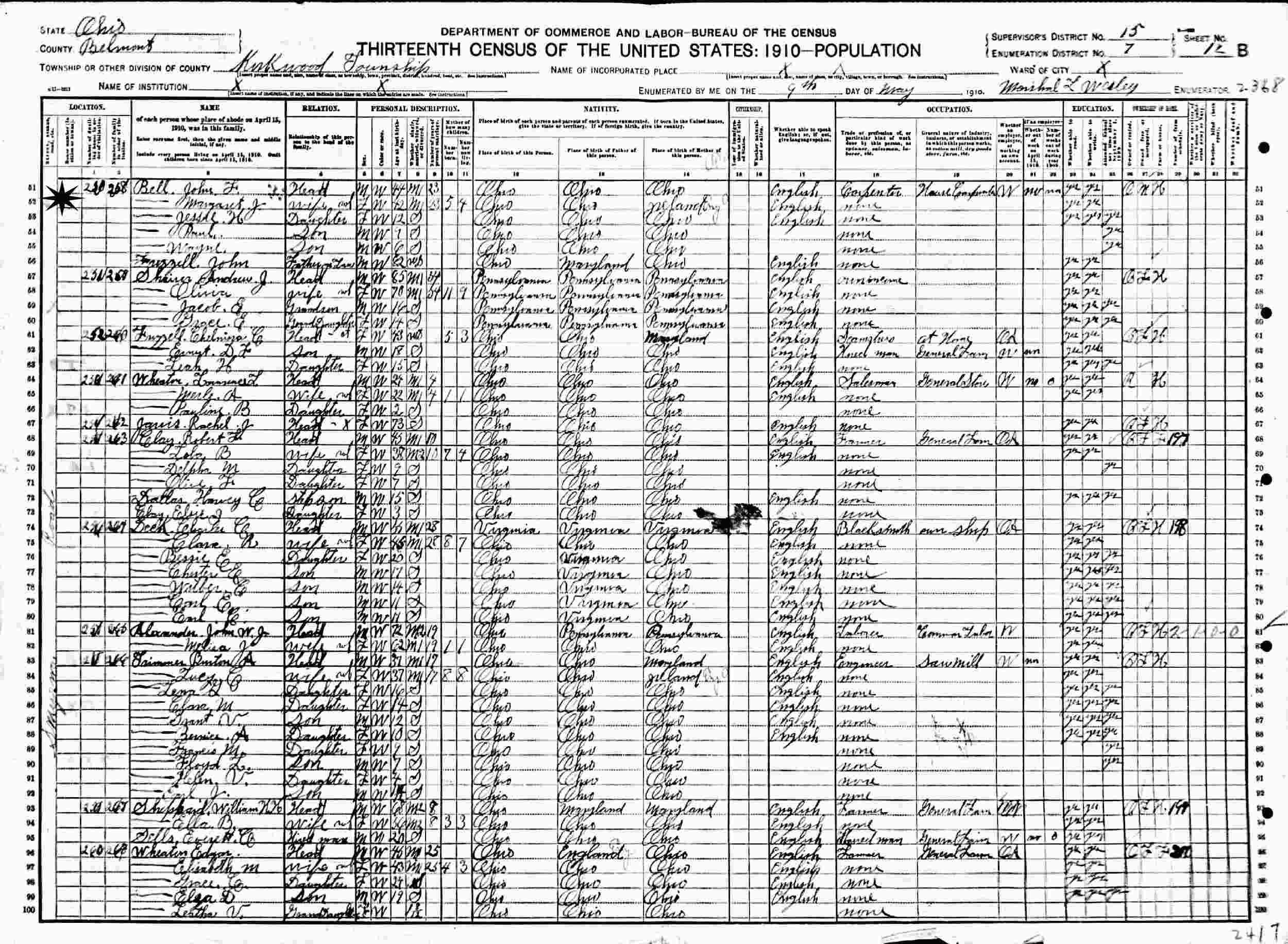 May 9, 1910 - Supervisor's District 15, Enumeration District 7, Kirkwood Township, Belmont County, Ohio.