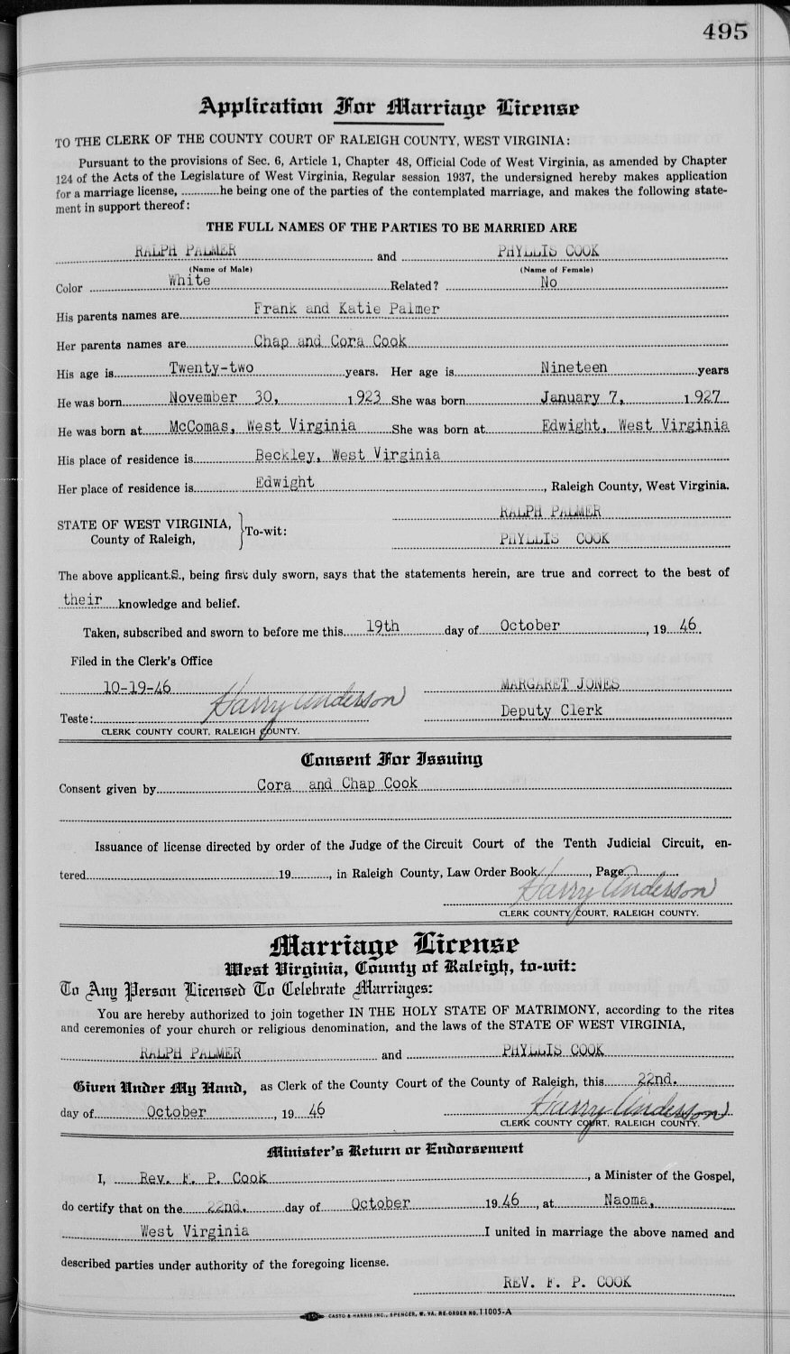 Married: Ralph Palmer October 22, 1946 in Naoma, Raleigh County, West Virginia.