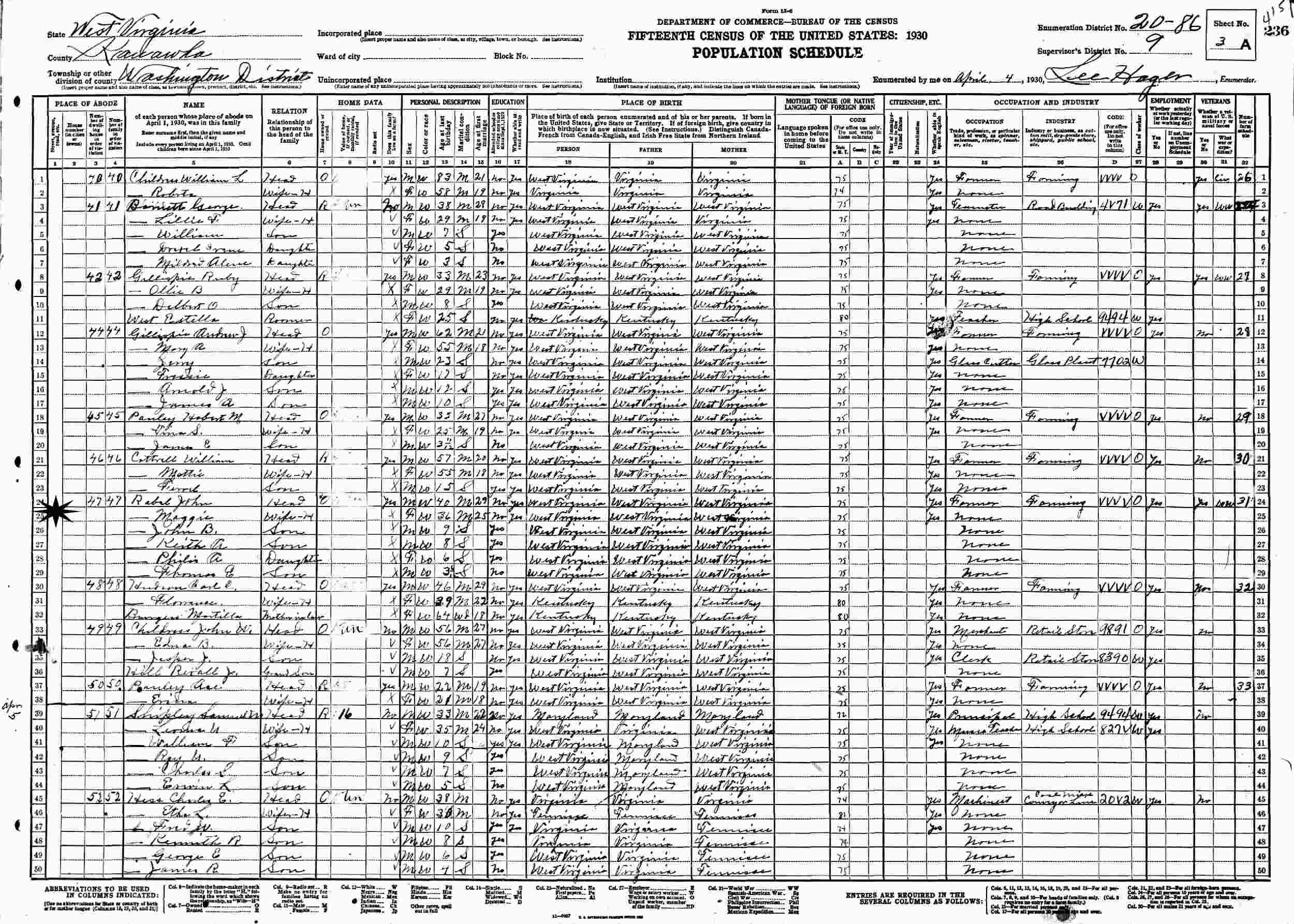 April 4, 1930 - Supervisor's District 9, Enumeration District 20-86, Washington District, Kanawha County, West Virginia.