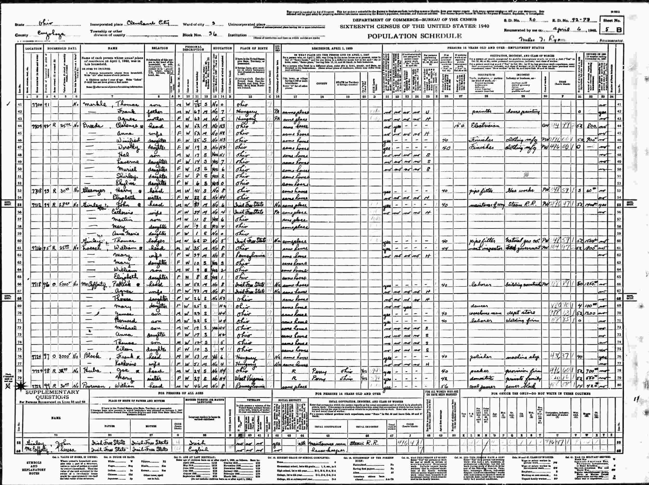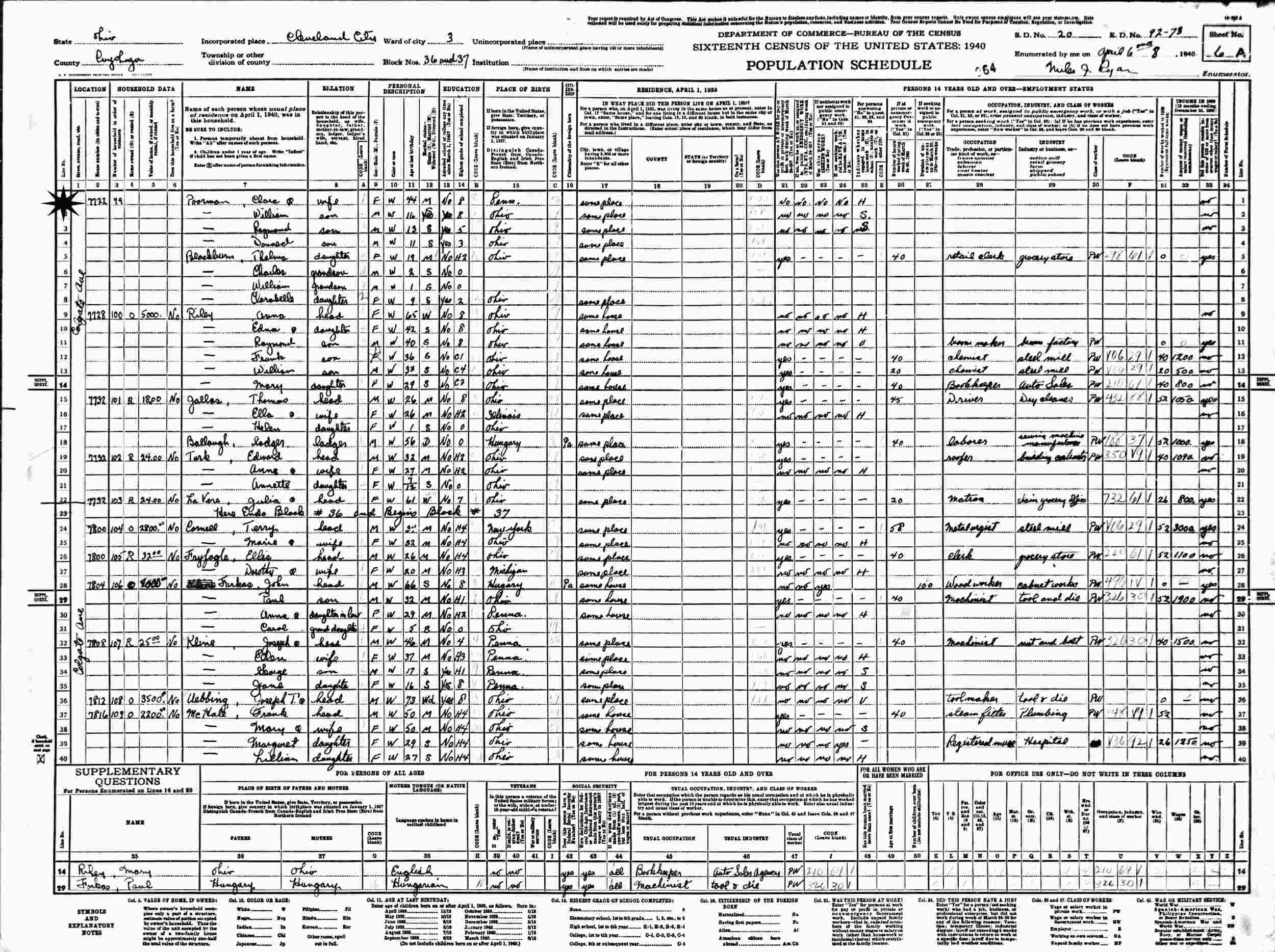 April 6, 1940 - 7722 Colgate, Ward 3, Block 36, Supervisor's District 20, Enumeration District 92-73, Cleveland, Cuyahoga County, Ohio.