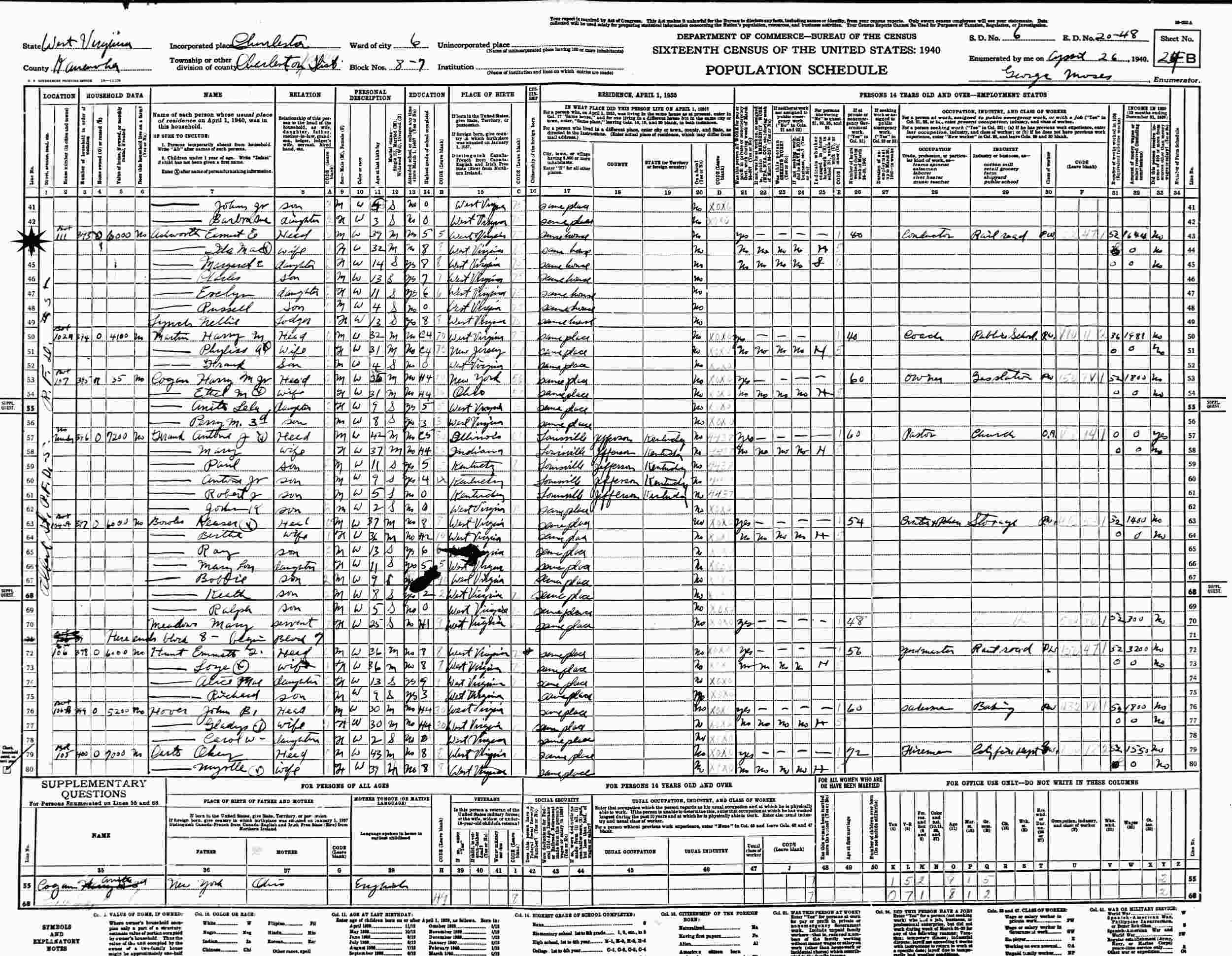 April 26, 1940 - R.F.D. 5, Ward 6, Blocks 8-7, Supervisor's District 6, Enumeration District 20-38, Charleston, Kanawha County, West Virginia.