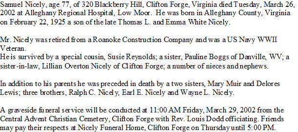 Notes for SAMUEL "SAM" HENRY NICELY: