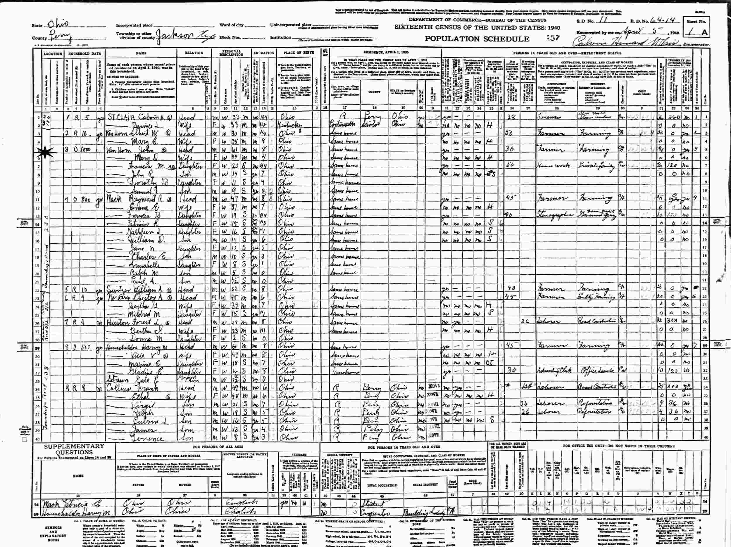 APril 5, 1940 - Township Road 230, Supervisor's District 11, Enumeration 64-14, Jackson Township, Perry County, Ohio.