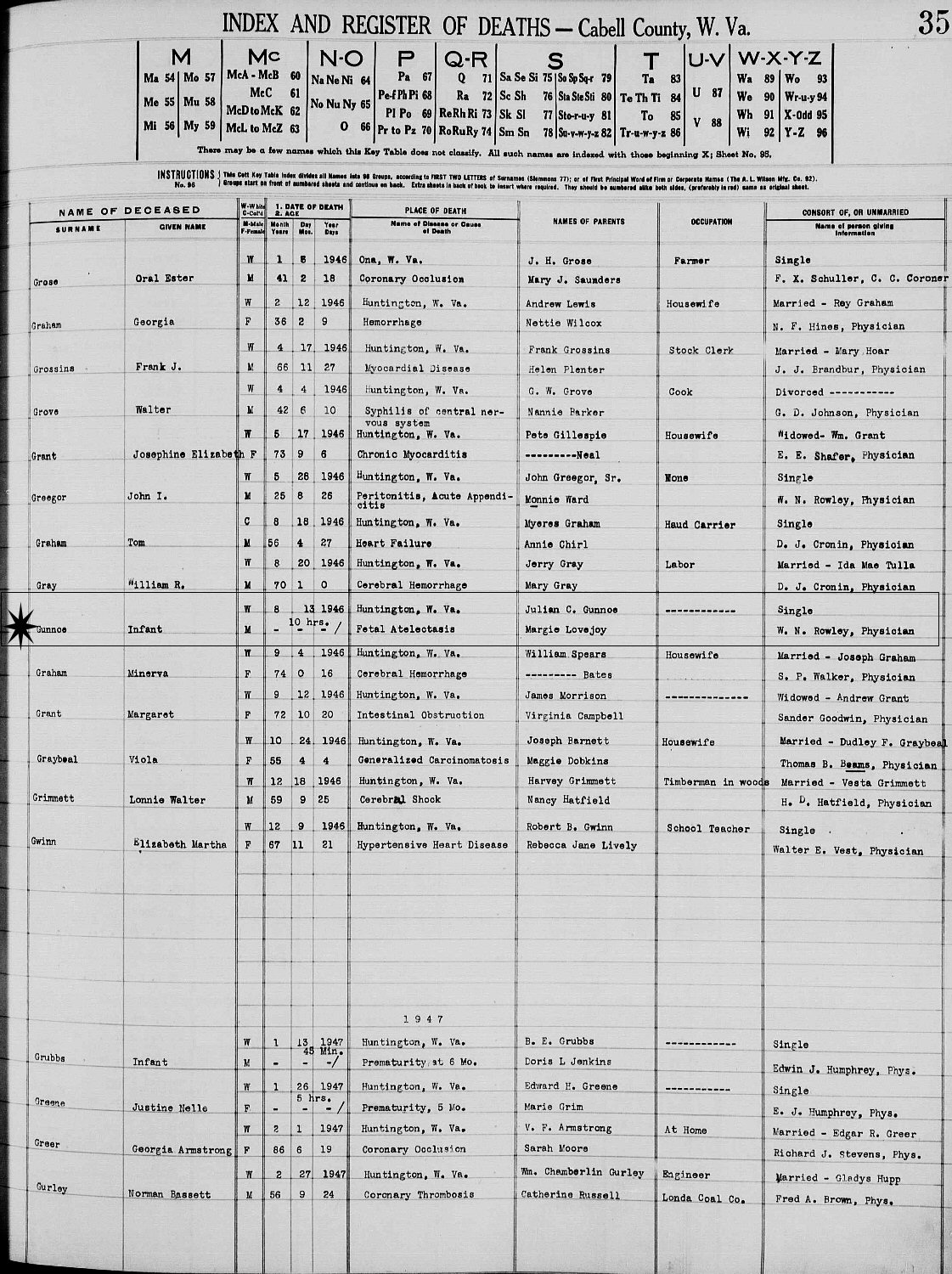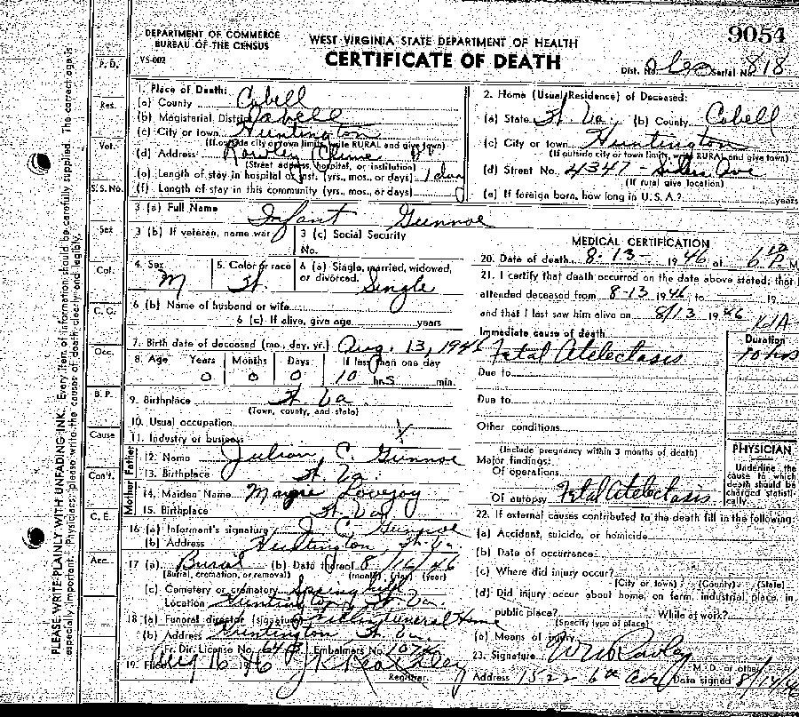 Notes for SON GUNNOE: Son of Julian Caesar and Margie Elaine (Lovejoy) Gunnoe. Born: September 13, 1946 in Huntington, Cabell County, West Virginia. Died: September 13, 1946 in Huntington, Cabell County, West Virginia.