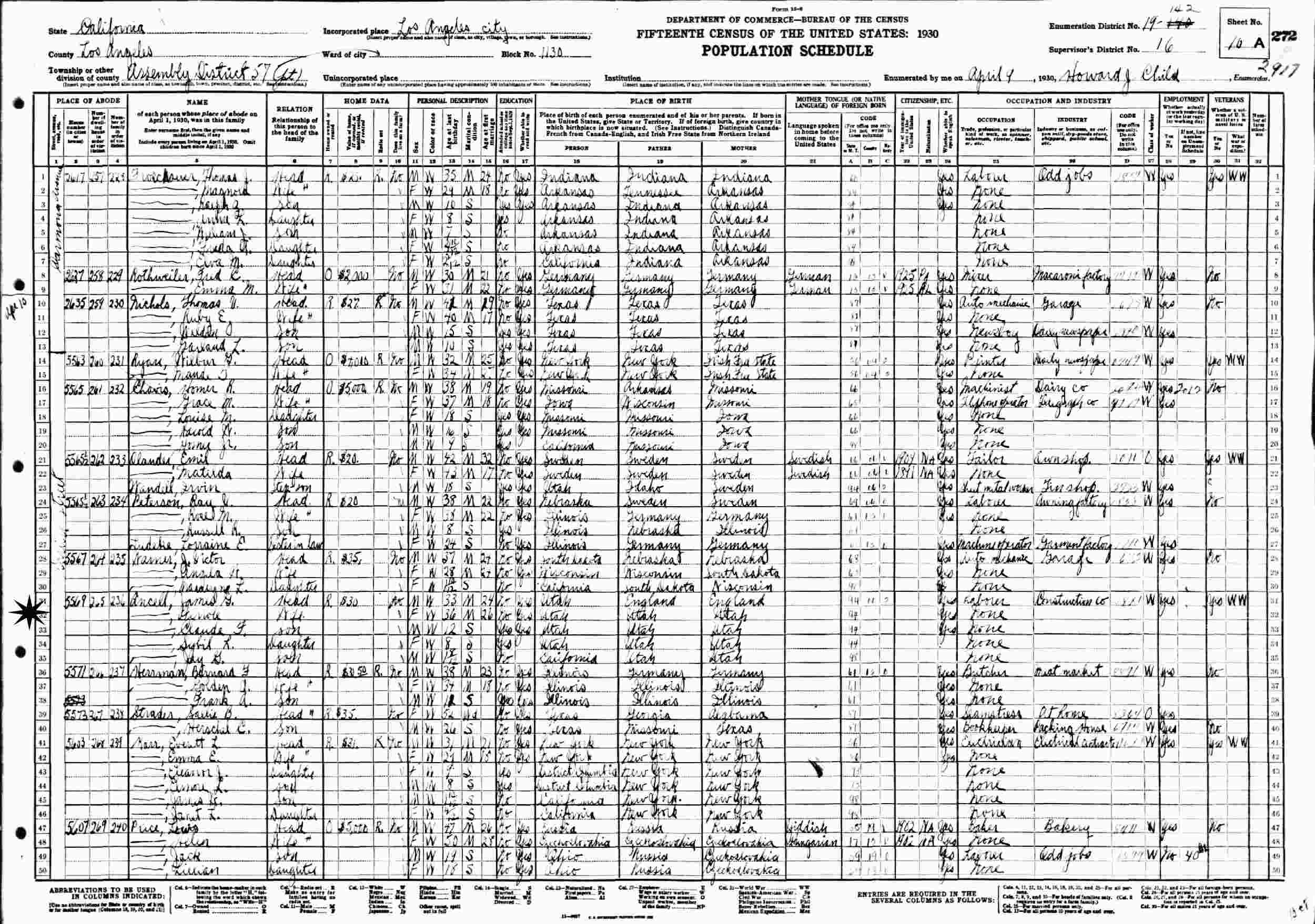 April 9, 1930 - 5569 Carlin Street, Assembly District 57, Block 1130, Supervisor's 16, Enumeration District 19-140 (crossed out to 142), Los Angeles, Los Angeles County, California.